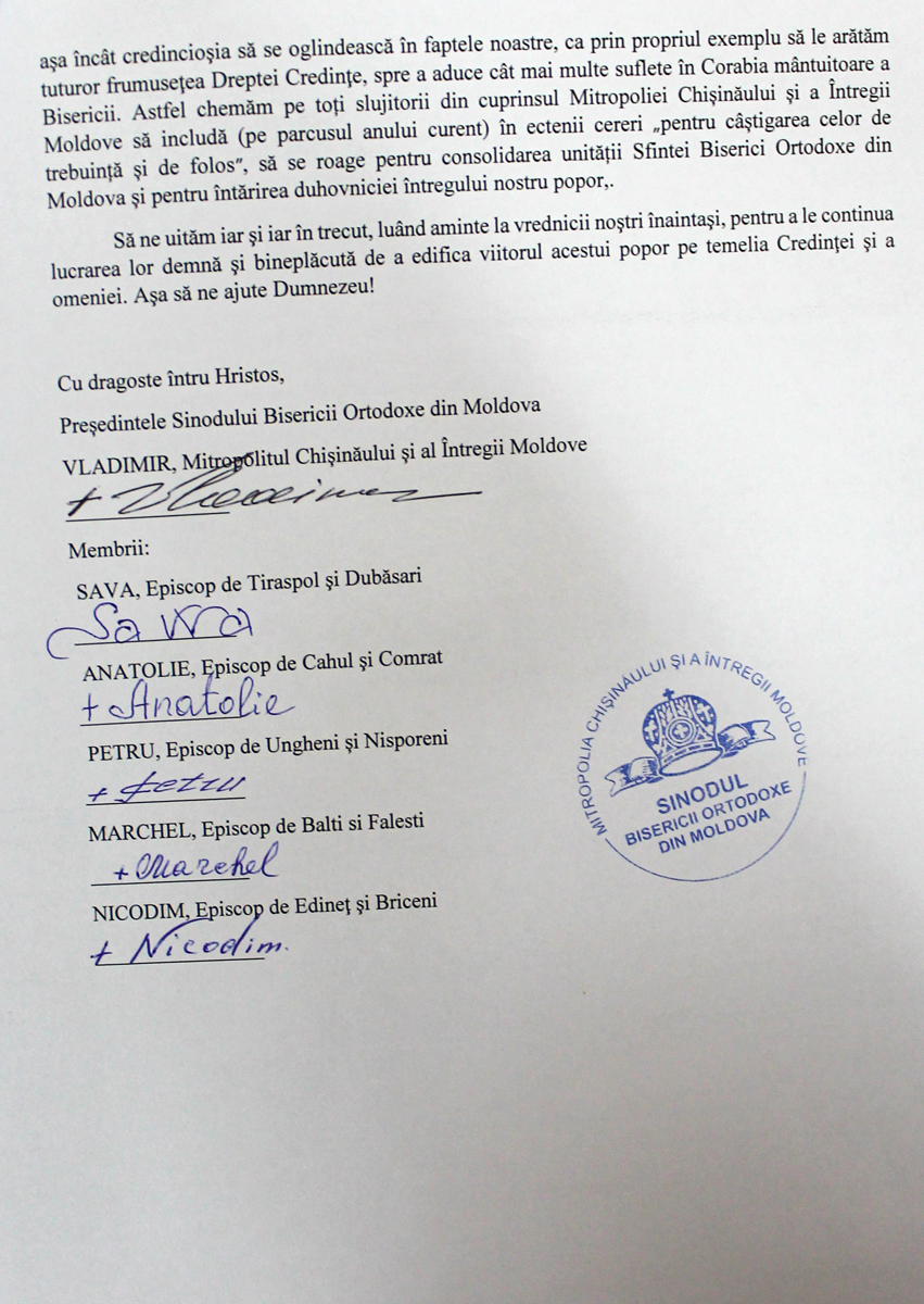 — заявление Синода Православной Церкви Молдовы относительно процессов секуляризации человеческого общества в Европейском Союзе;