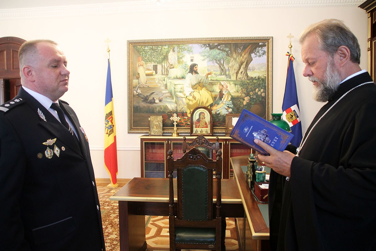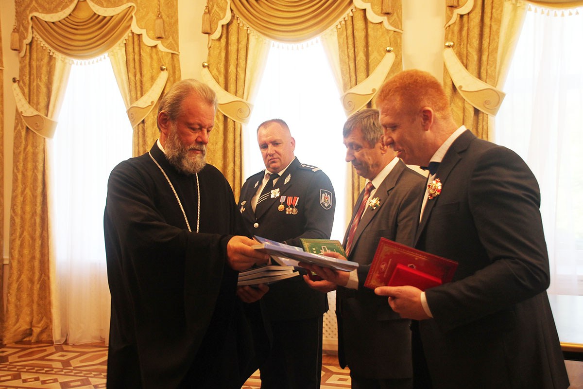 В продолжении встречи, Владыка Митрополит поблагодарил гостей за приложенные труды и усилия по оказанию посильной помощи Православной Церкви Молдовы, после чего передал в дар каждому из присутствующих наборы религиозной литературы.