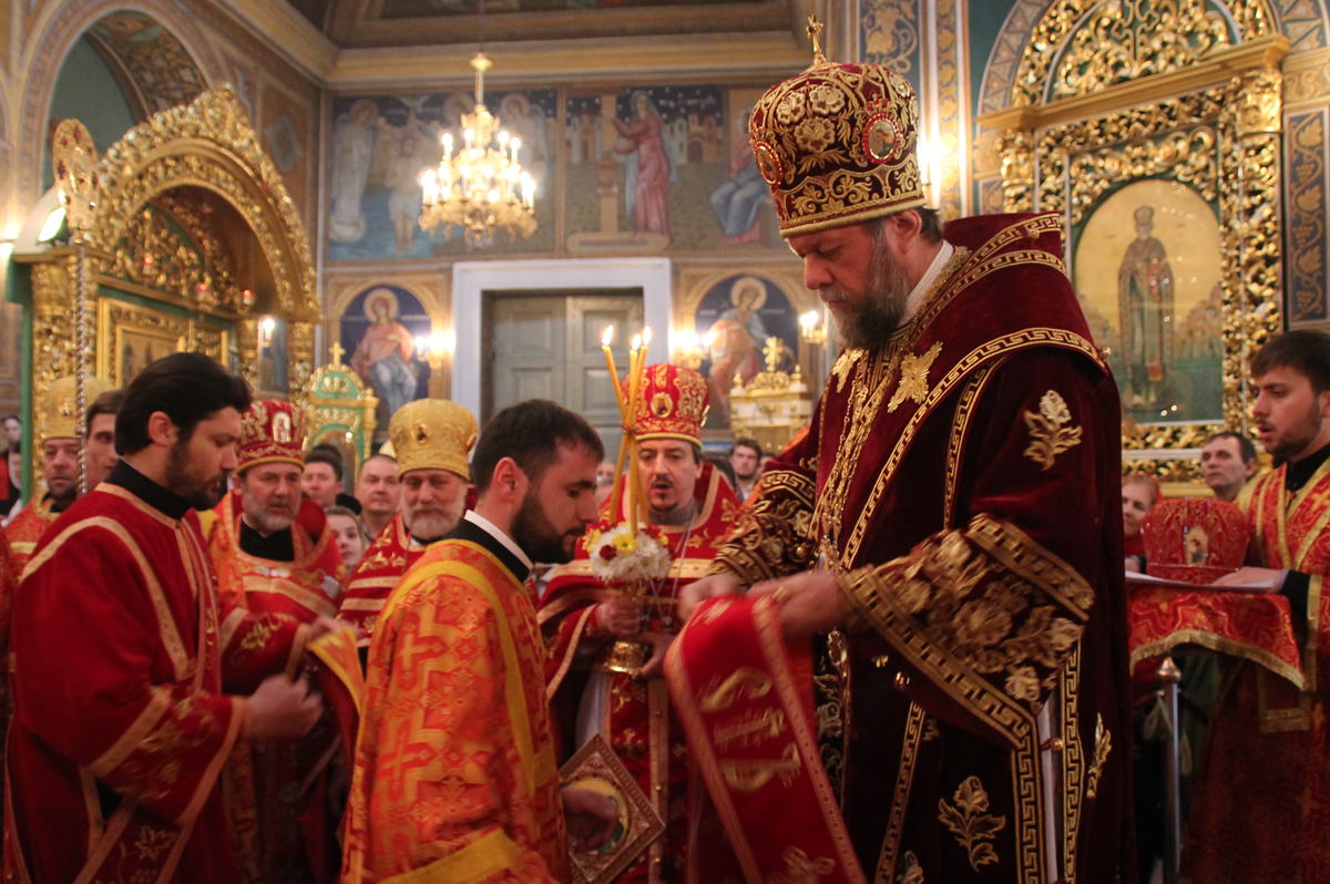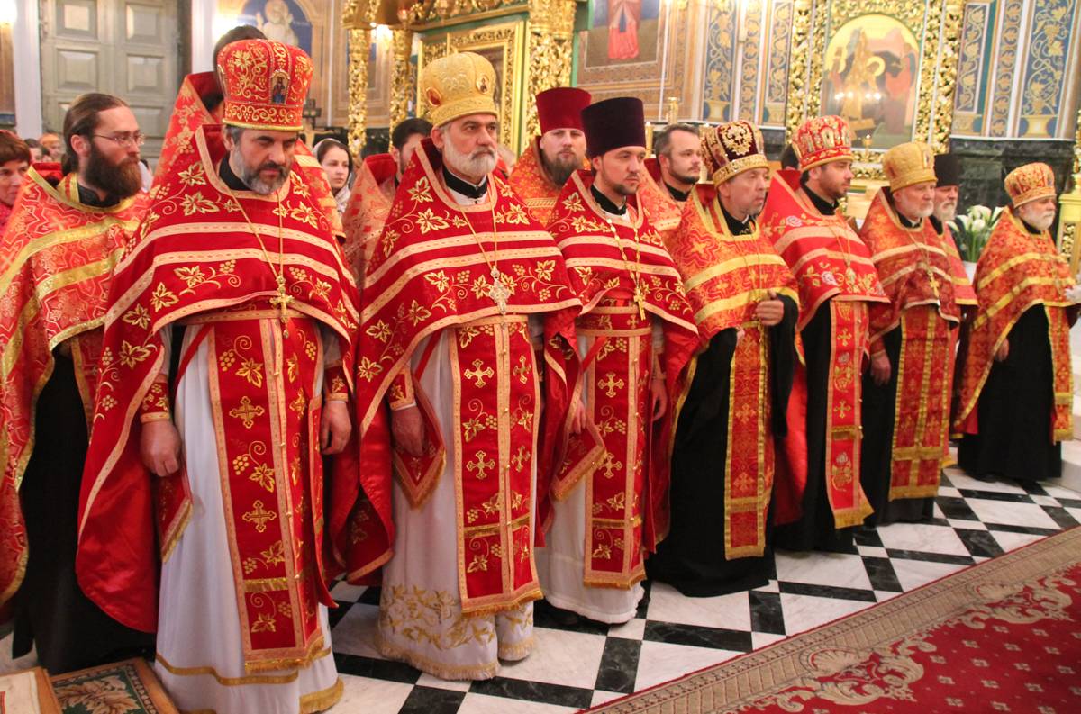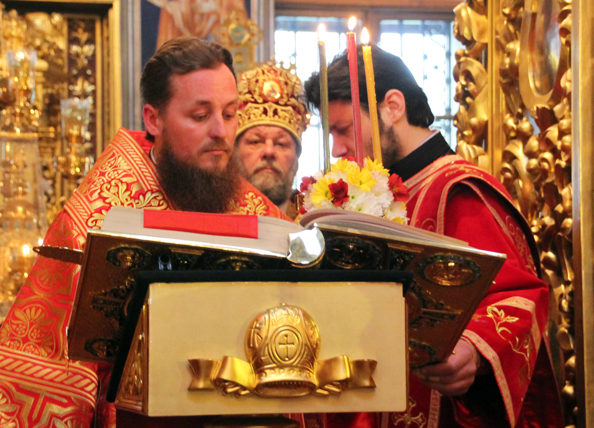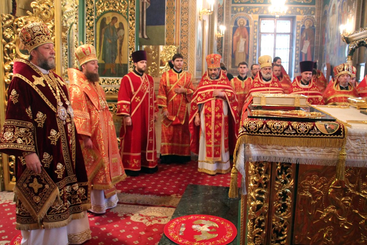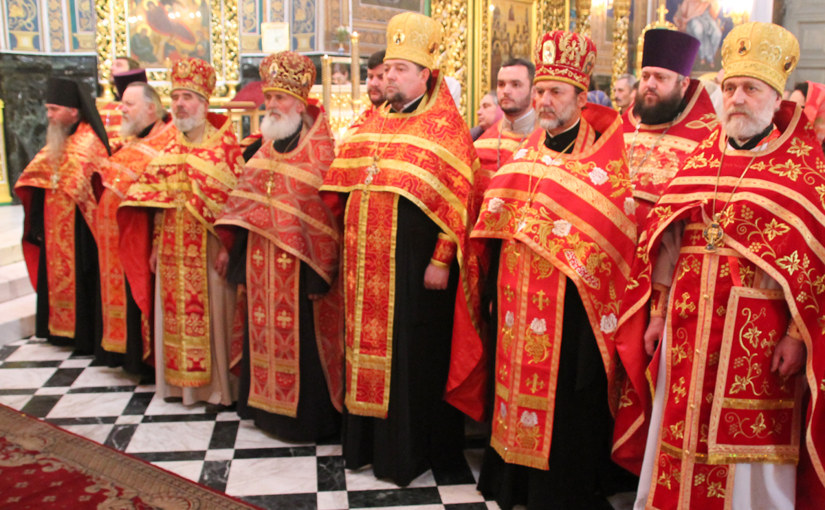 Его Высокопреосвященству сослужили: Преосвященный епископ Сорокский Иоанн, викарий Кишиневской епархии, секретарь Кишиневско-Молдавской митрополии митр. прот. Вадим Кейбаш, благочинный церквей Яловенского района митр. прот. Анатолий Стефанов, настоятель Никольского Добрушского мужского монастыря игумен Петр (Томачинский), настоятель Успенского Бутученского мужского скита игумен Владимир (Поя), священнослужители Яловенского и Кишиневского благочиний, соборное духовенство.