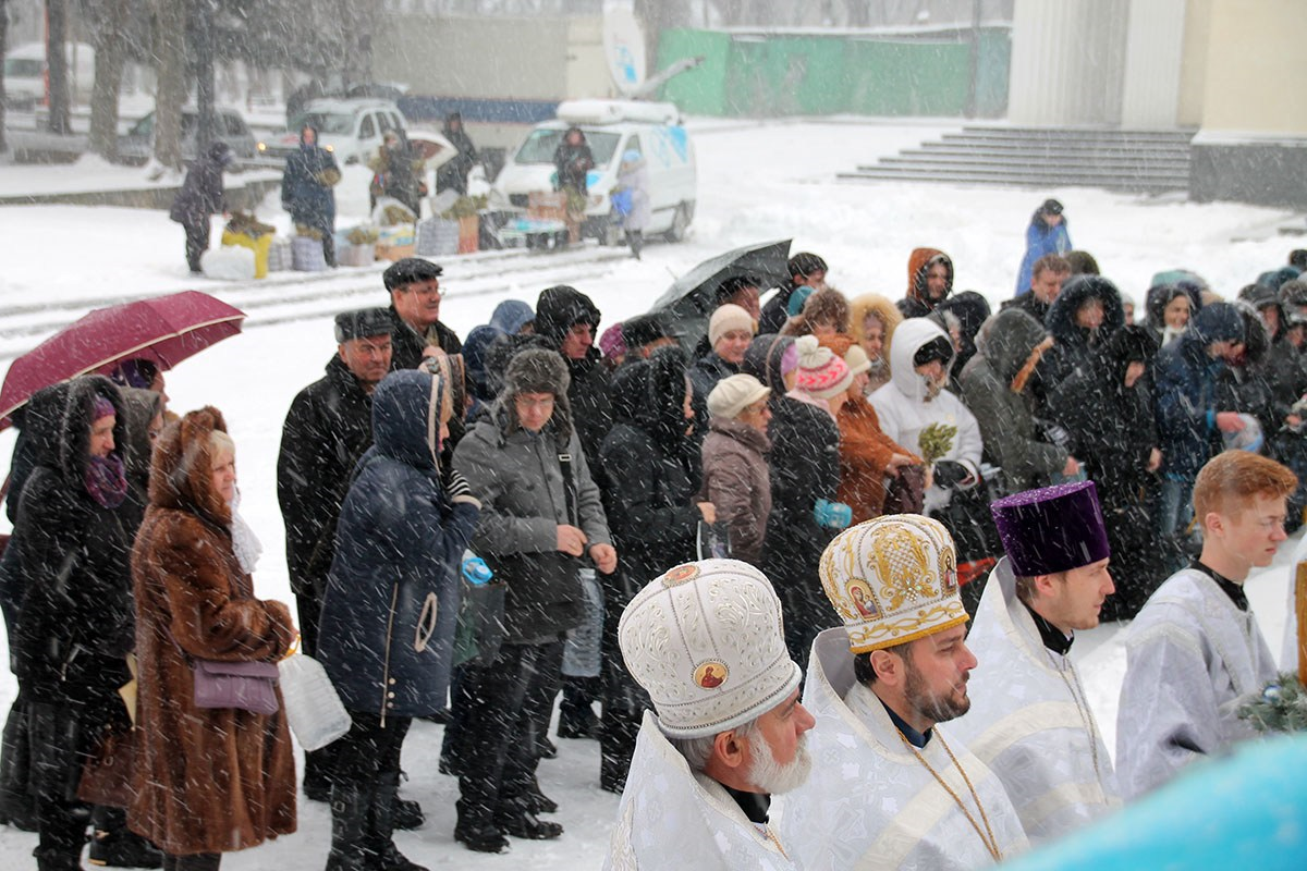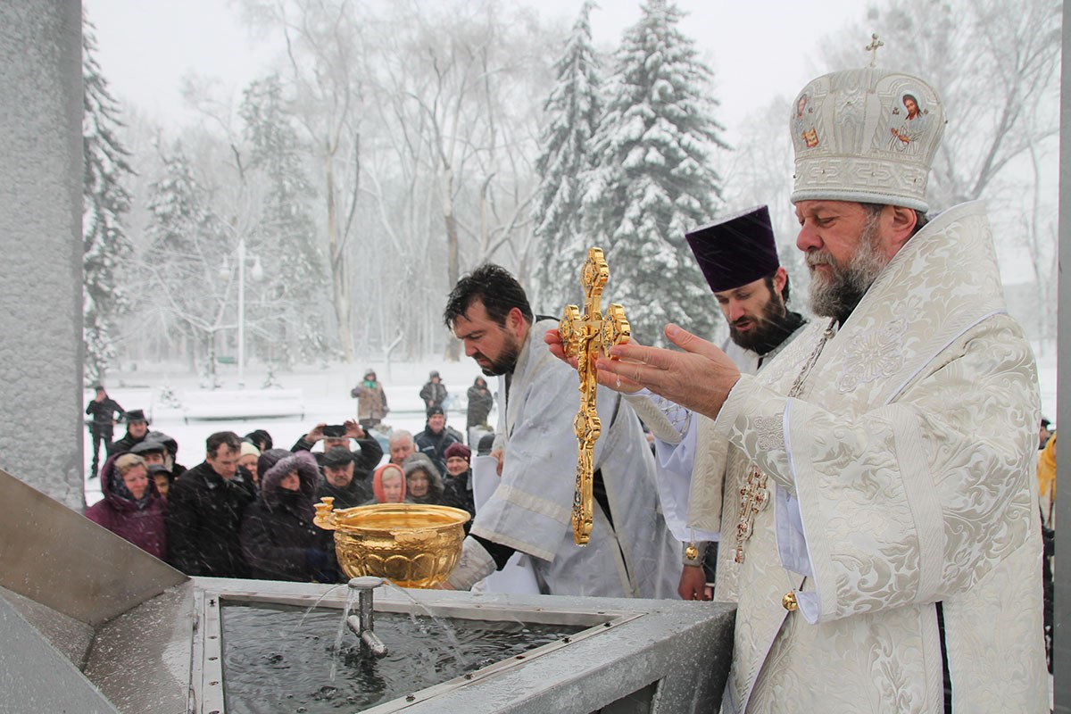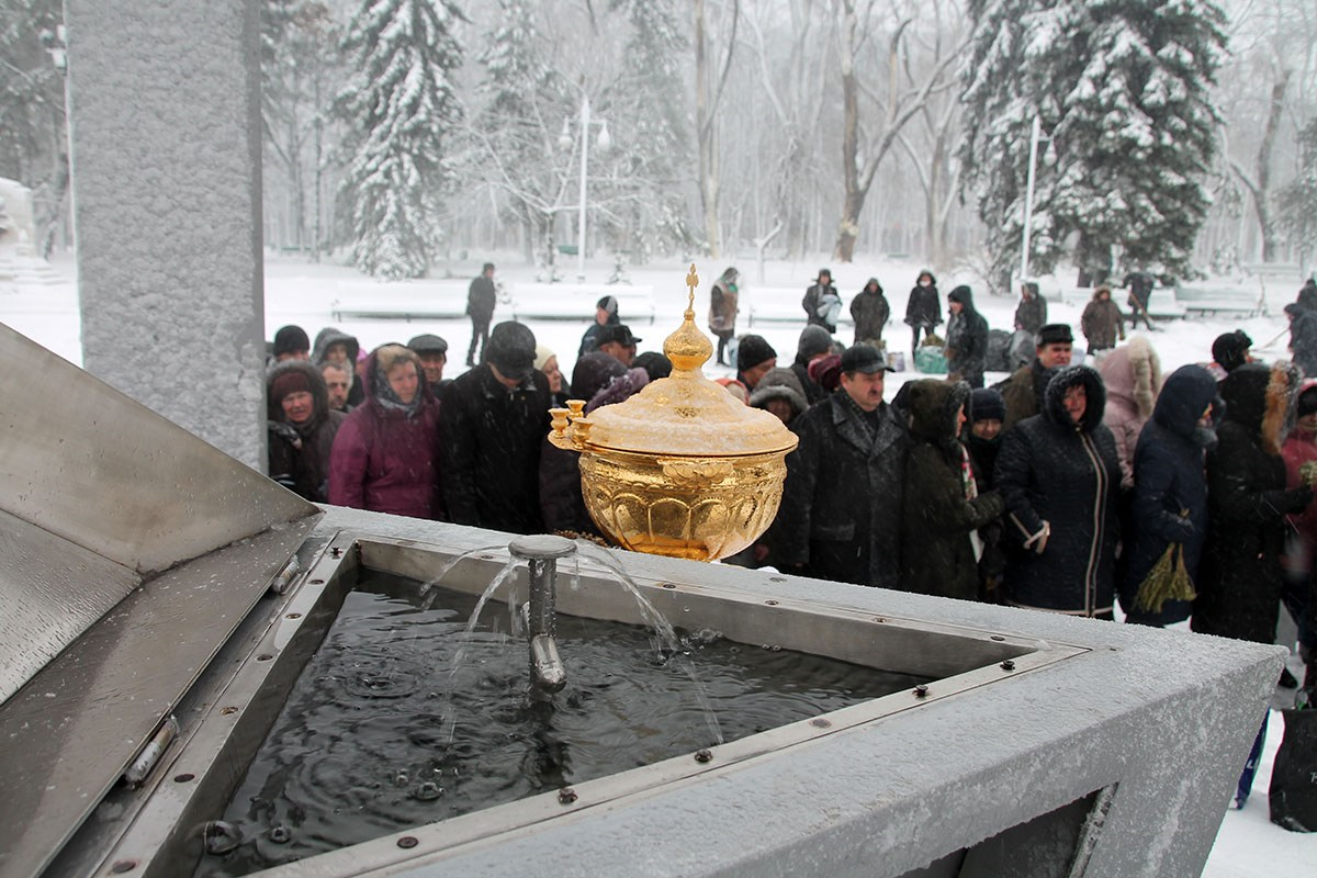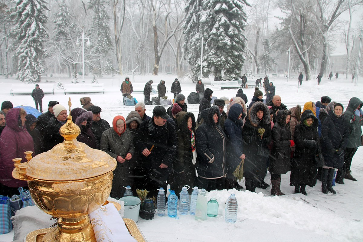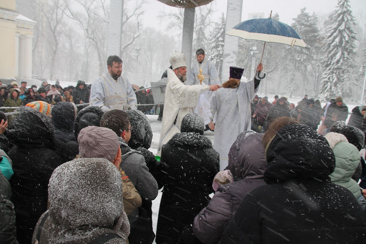 По окончании Литургии на соборной площади Высокопреосвященный Митрополит Владимир совершил чин великого освящения воды и окропил всех молящихся великой агиасмой под пение тропаря праздника Богоявления.