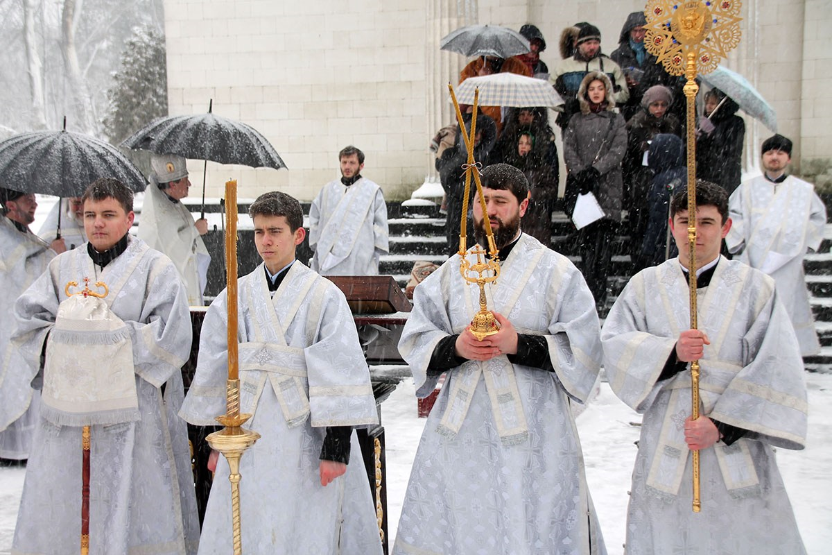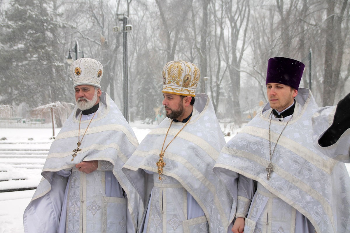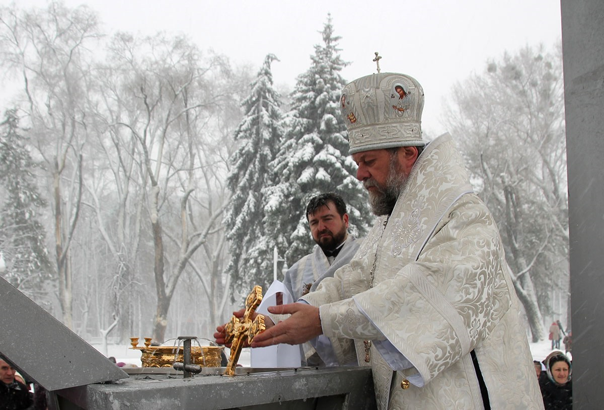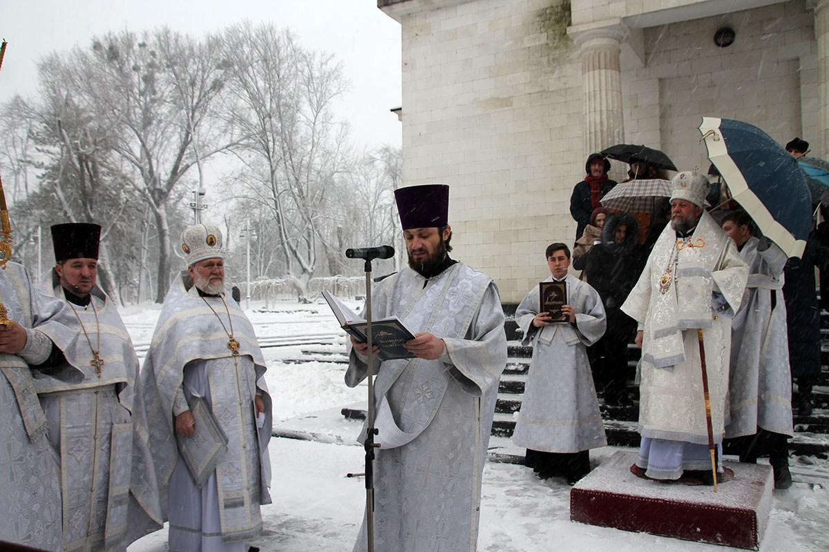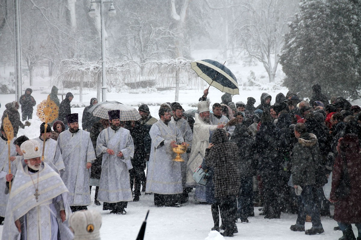 По окончании Литургии на соборной площади Высокопреосвященный Митрополит Владимир совершил чин великого освящения воды и окропил всех молящихся великой агиасмой под пение тропаря праздника Богоявления.