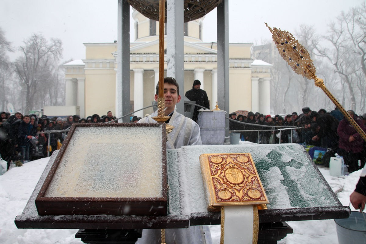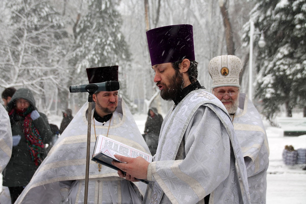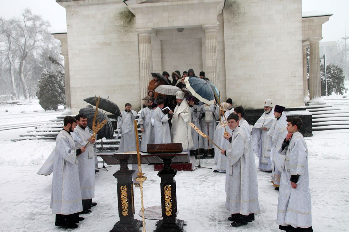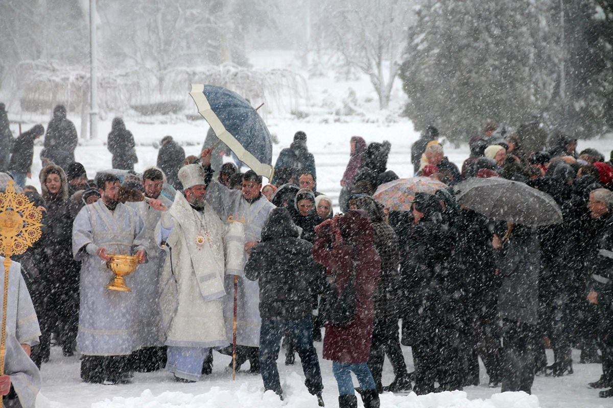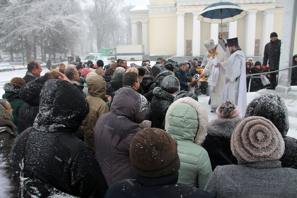 По окончании Литургии на соборной площади Высокопреосвященный Митрополит Владимир совершил чин великого освящения воды и окропил всех молящихся великой агиасмой под пение тропаря праздника Богоявления.