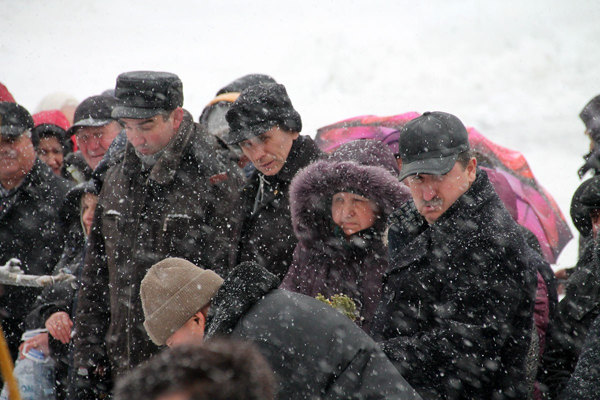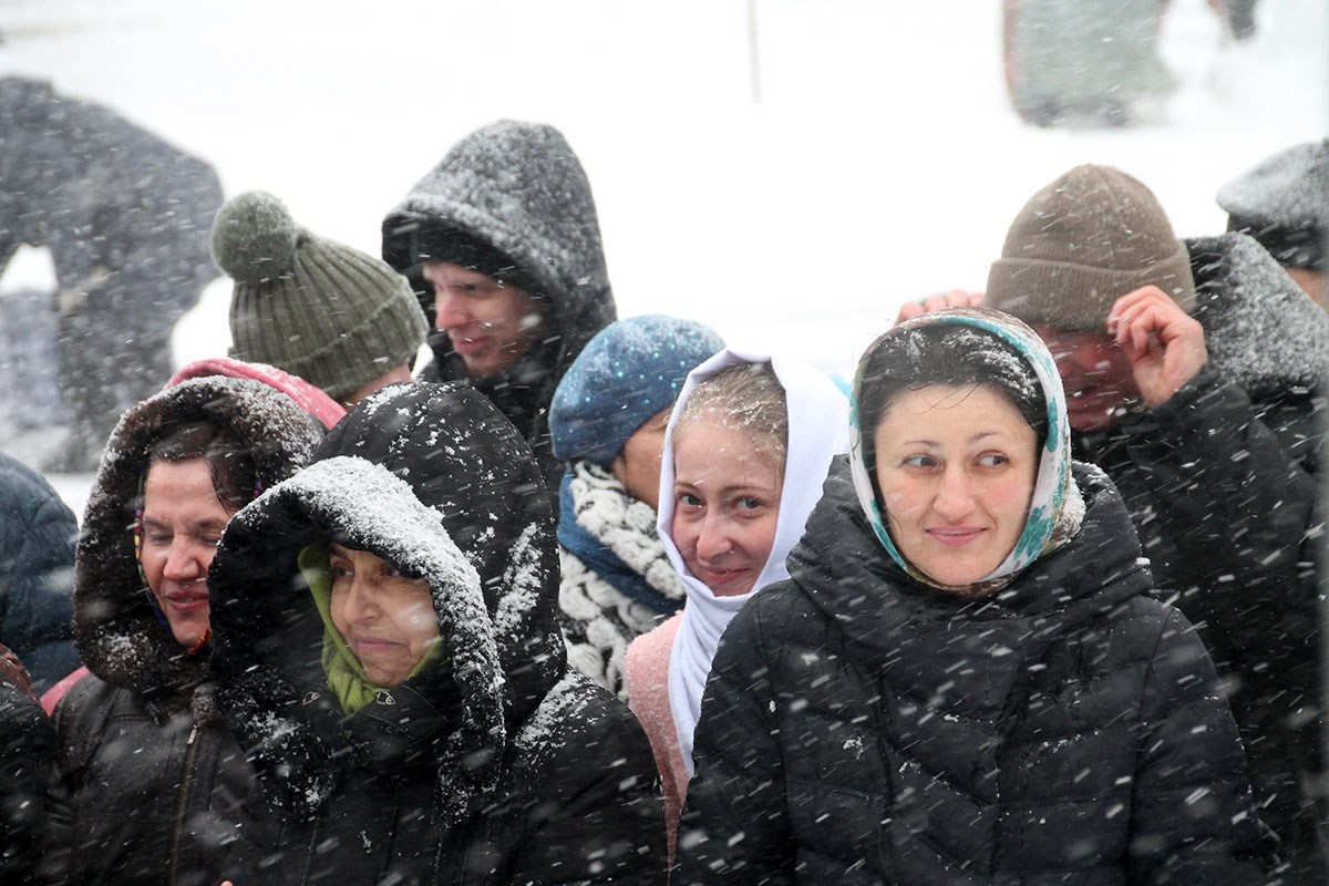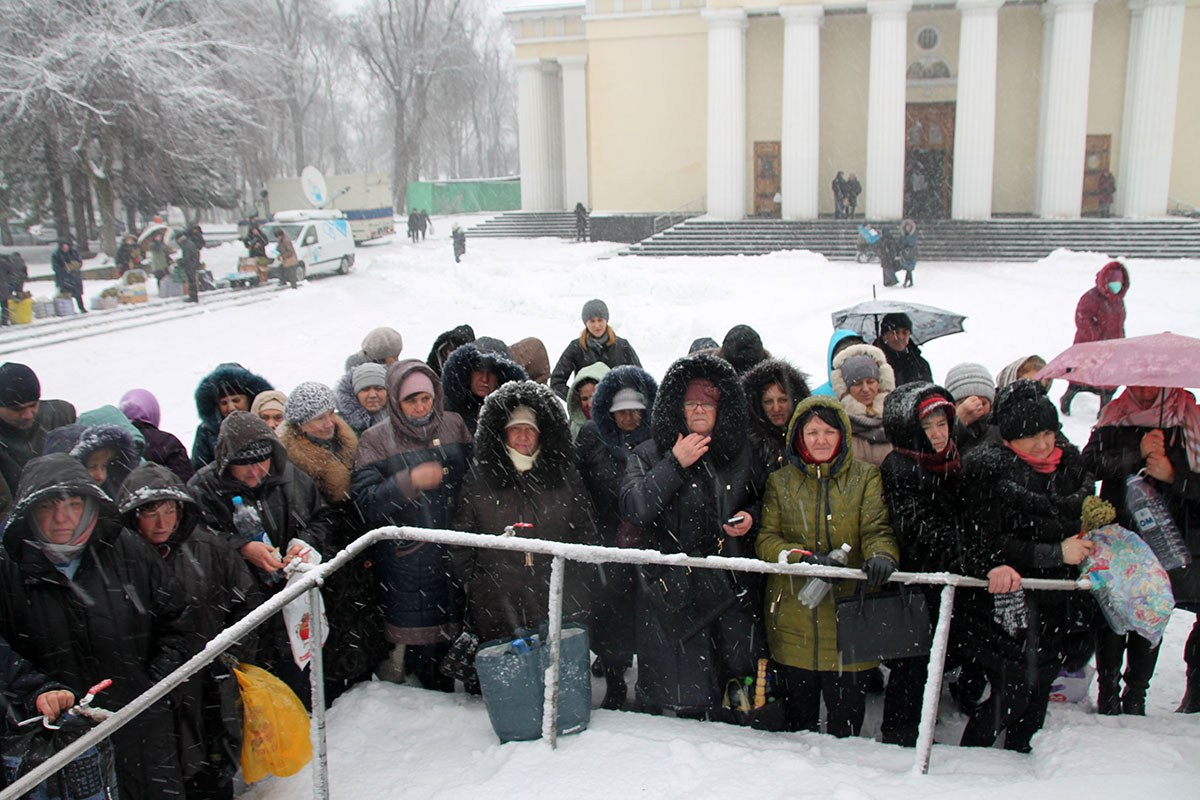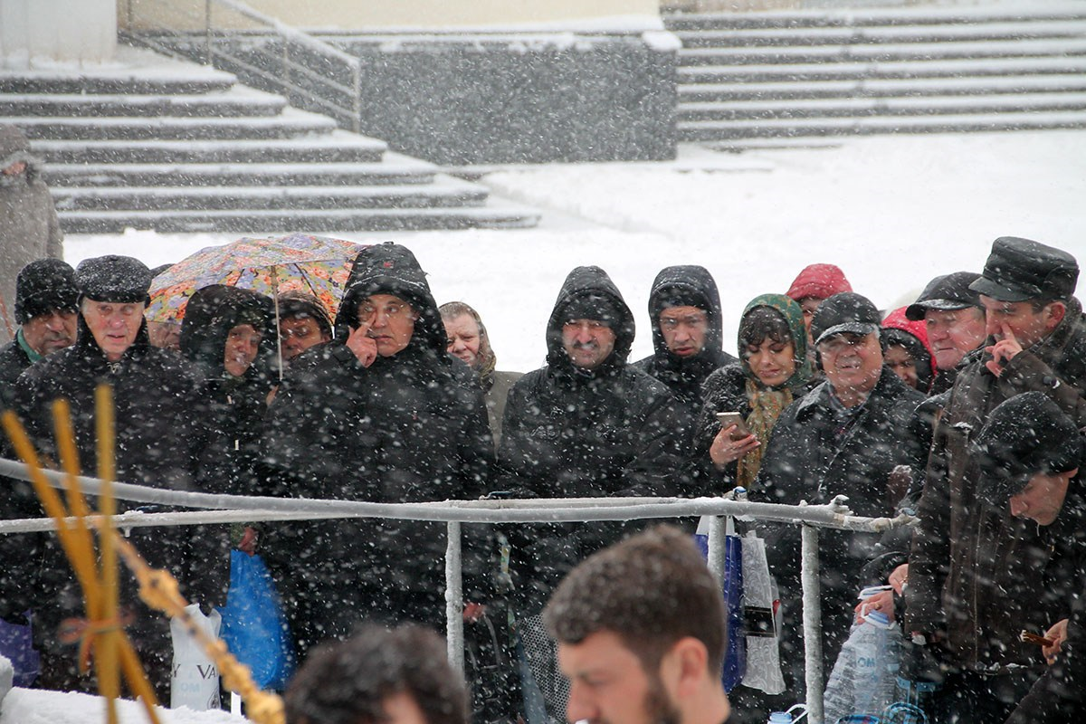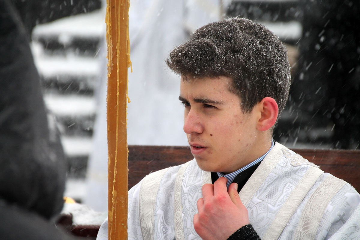 По окончании Литургии на соборной площади Высокопреосвященный Митрополит Владимир совершил чин великого освящения воды и окропил всех молящихся великой агиасмой под пение тропаря праздника Богоявления.
