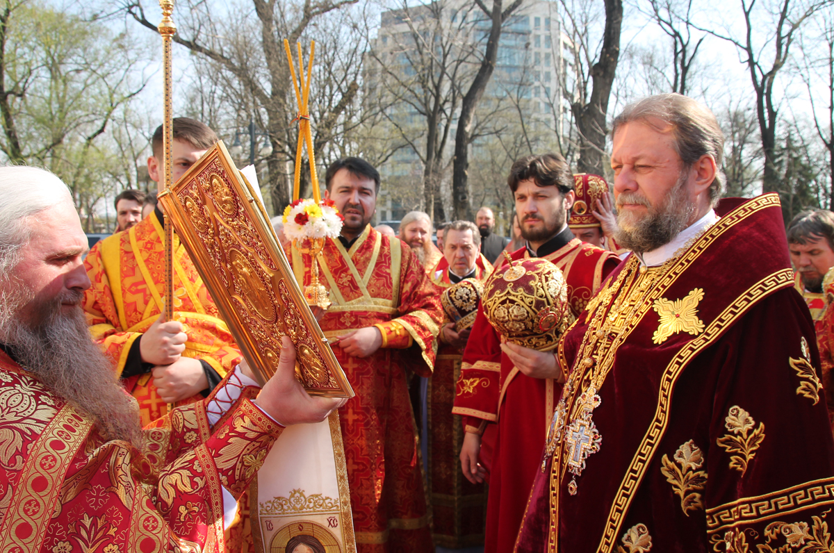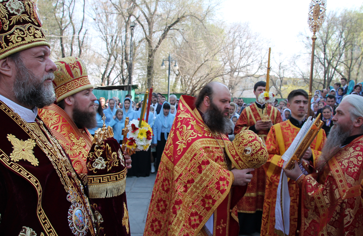 По окончании Литургии Высокопреосвященный Владыка Митрополит возглавил пасхальный крестный ход вокруг собора, в завершении которого был совершен благодарственный молебен и были возглашены многолетия.