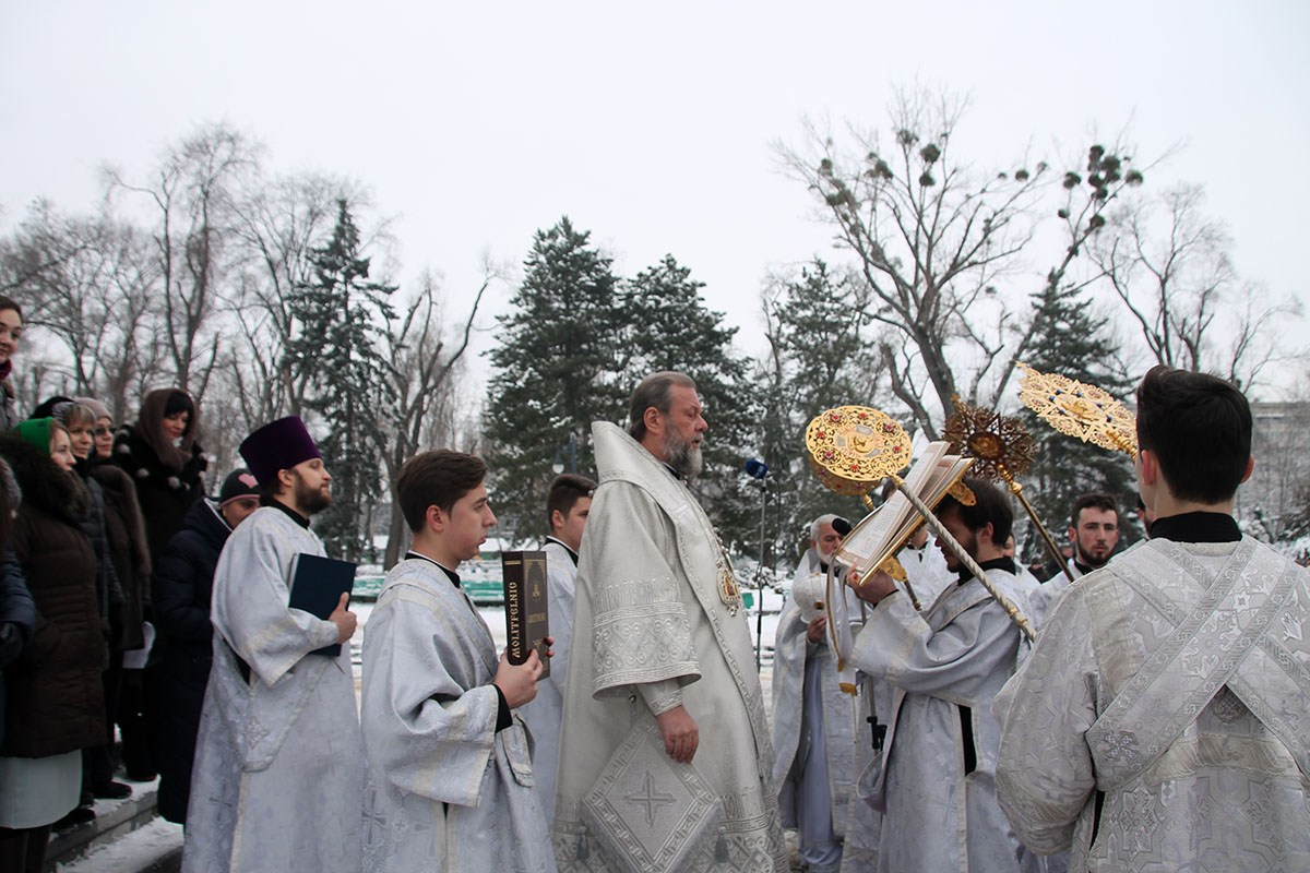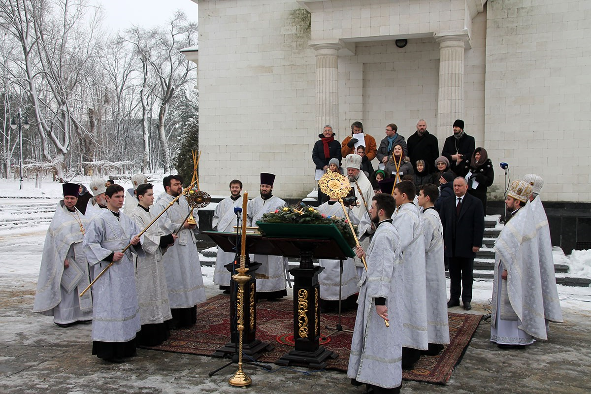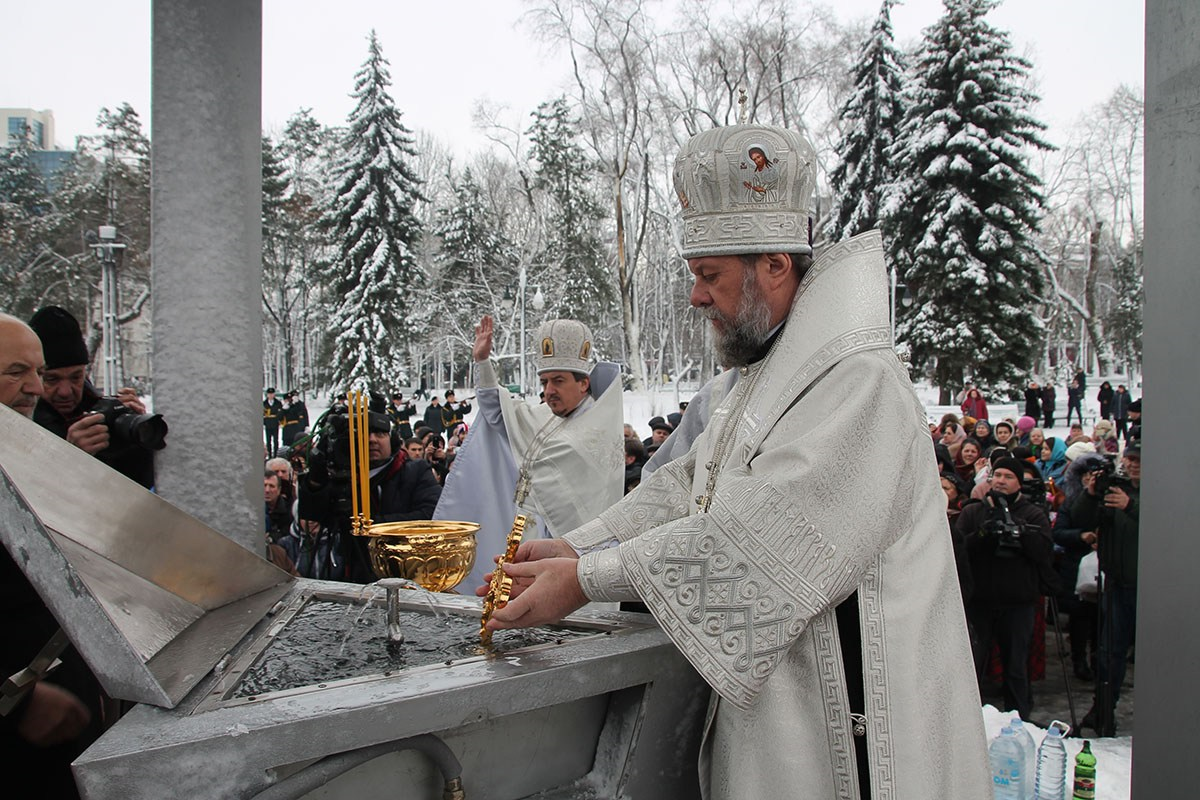 По заамвонной молитве при пении тропарей «Глас Господень на водах» священнослужители вышли на соборную площадь перед специально устроенной «Иорданью», где было совершено великое освящение воды.