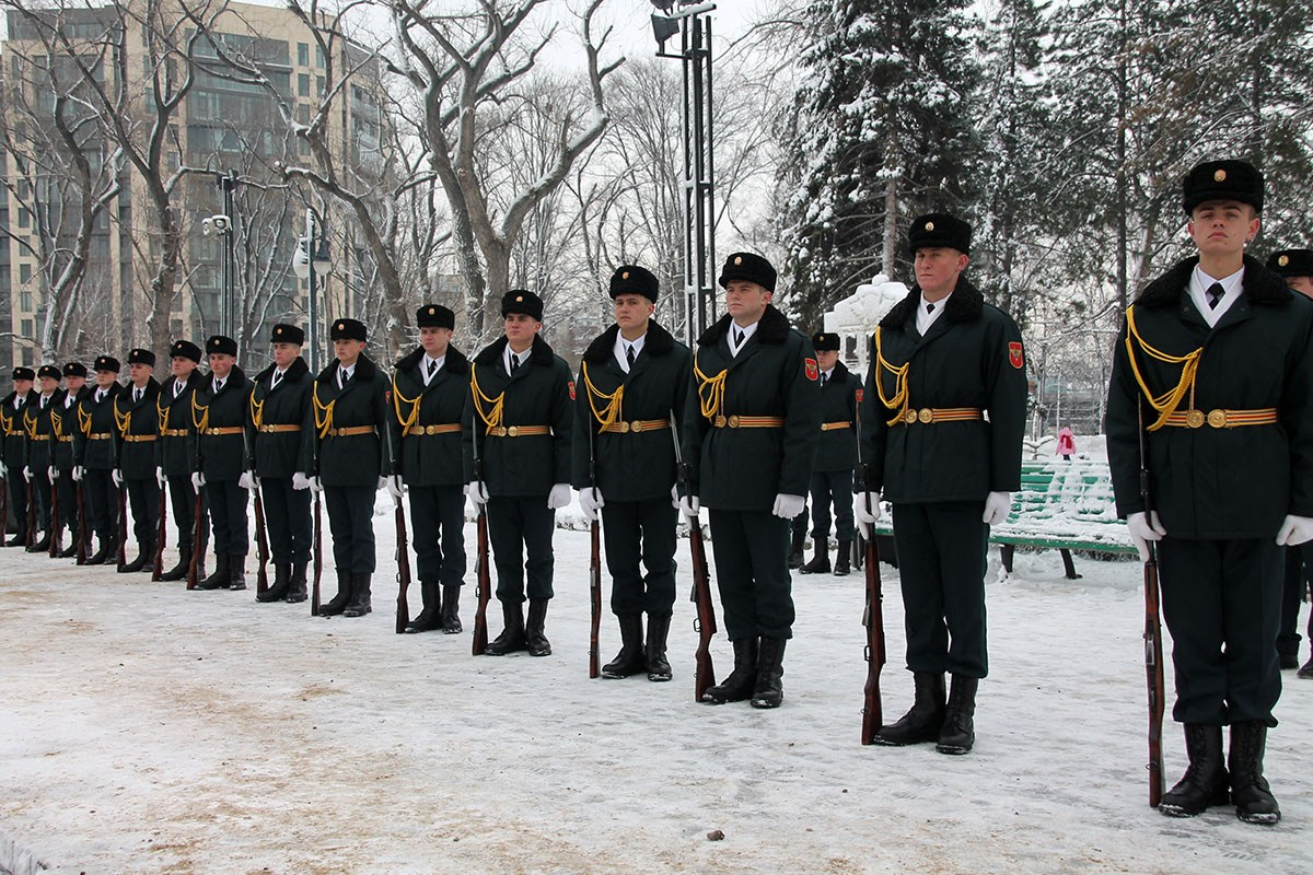 По установившейся доброй традицией при освящении воды военнослужащие специального караула Национальной Армии совершили три залпа из ружей.