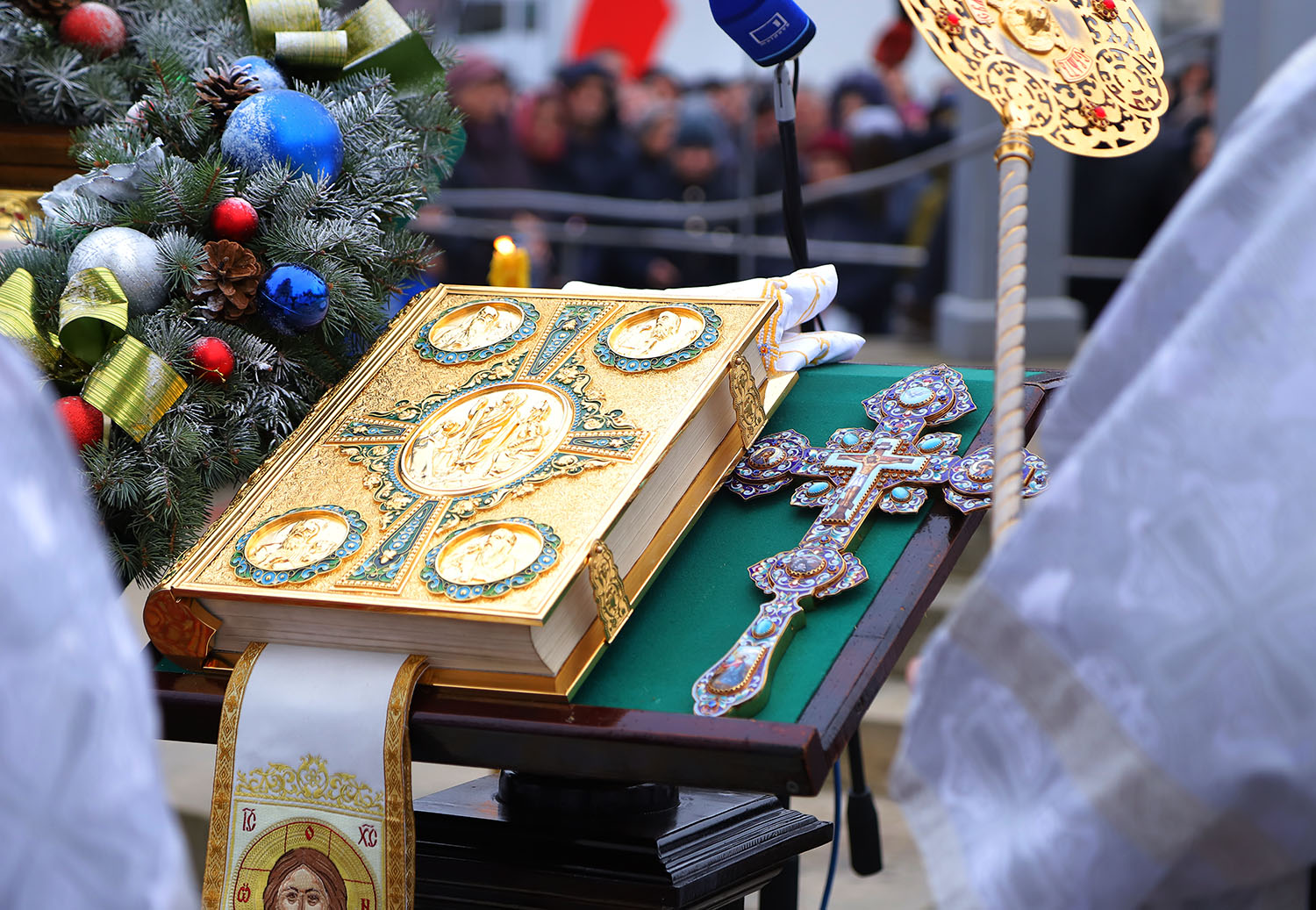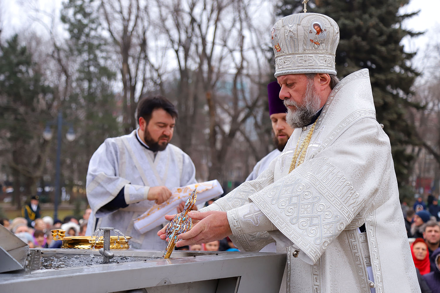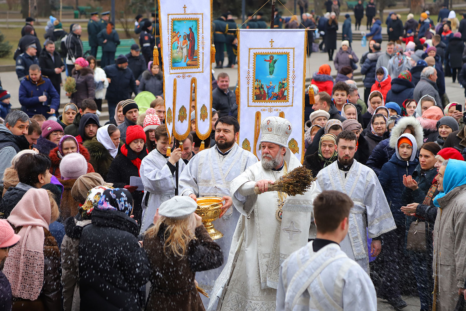 По заамвонной молитве при пении тропарей «Глас Господень на водах» священнослужители вышли на соборную площадь перед специально устроенной «Иорданью», где было совершено великое освящение воды.