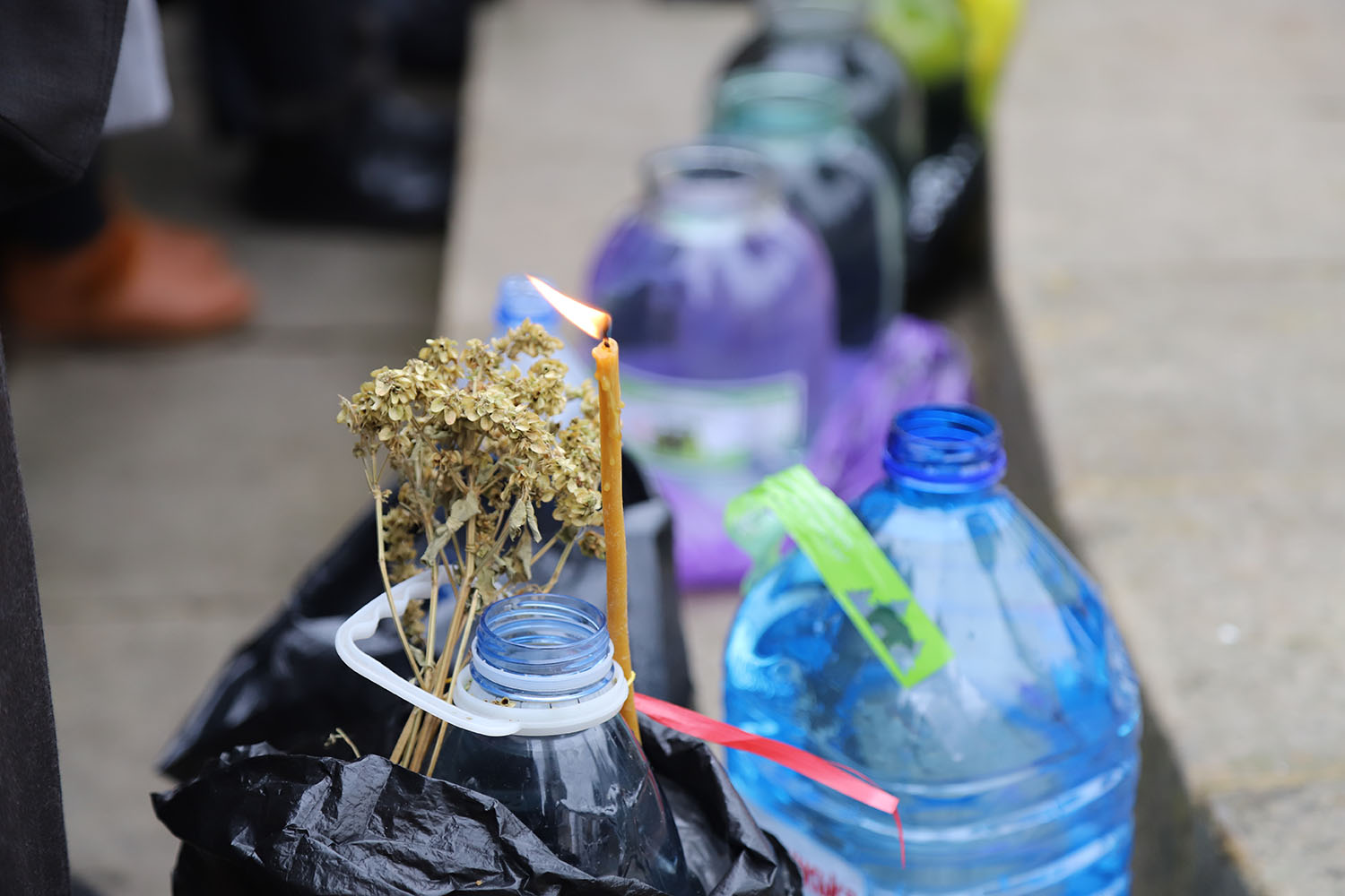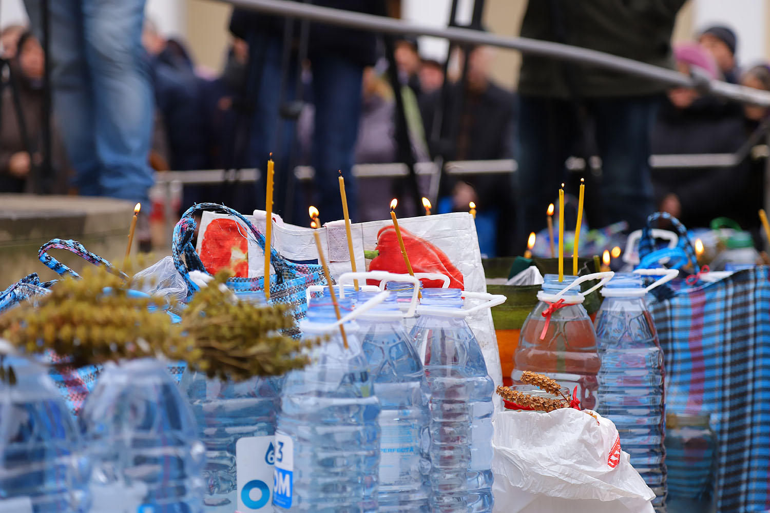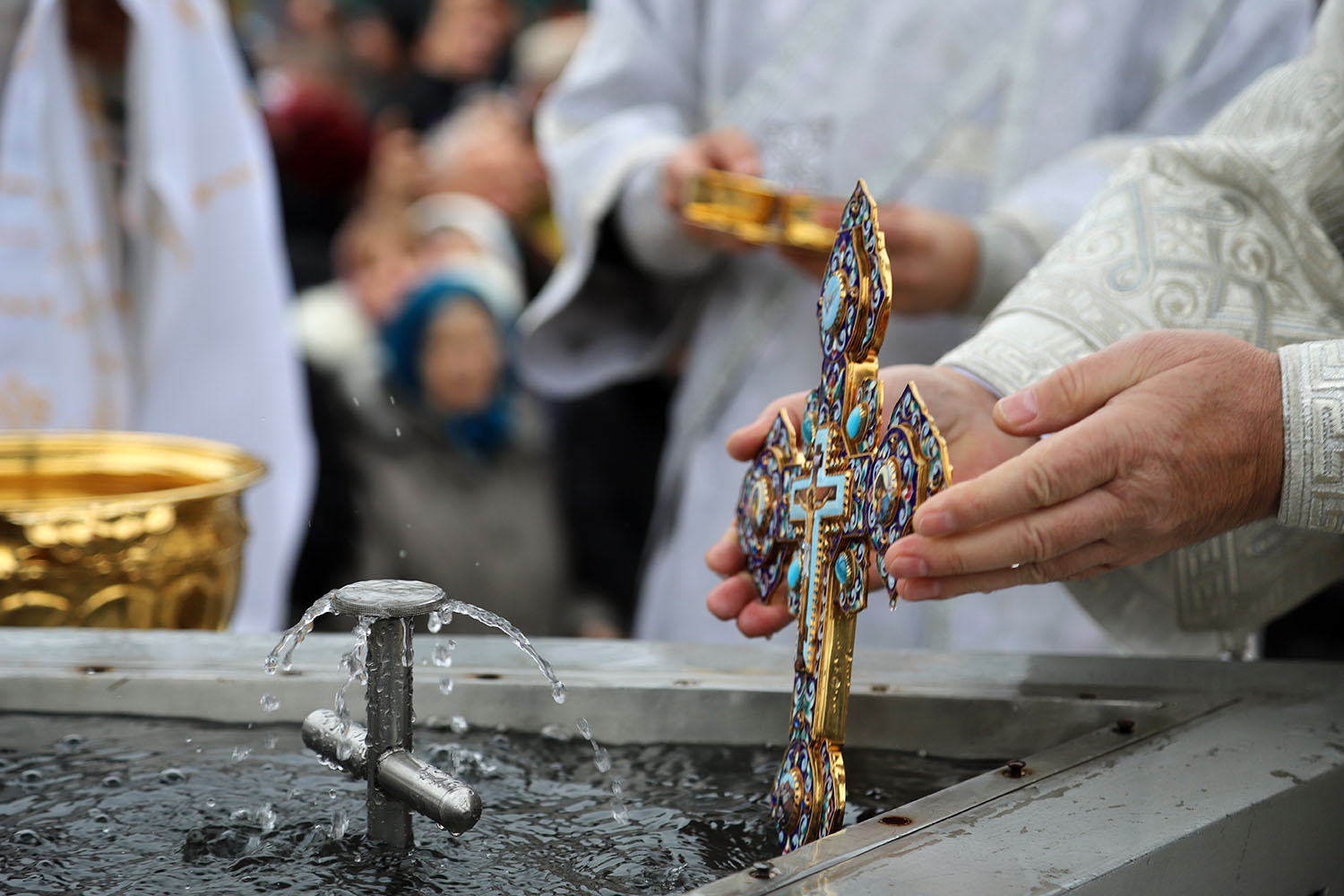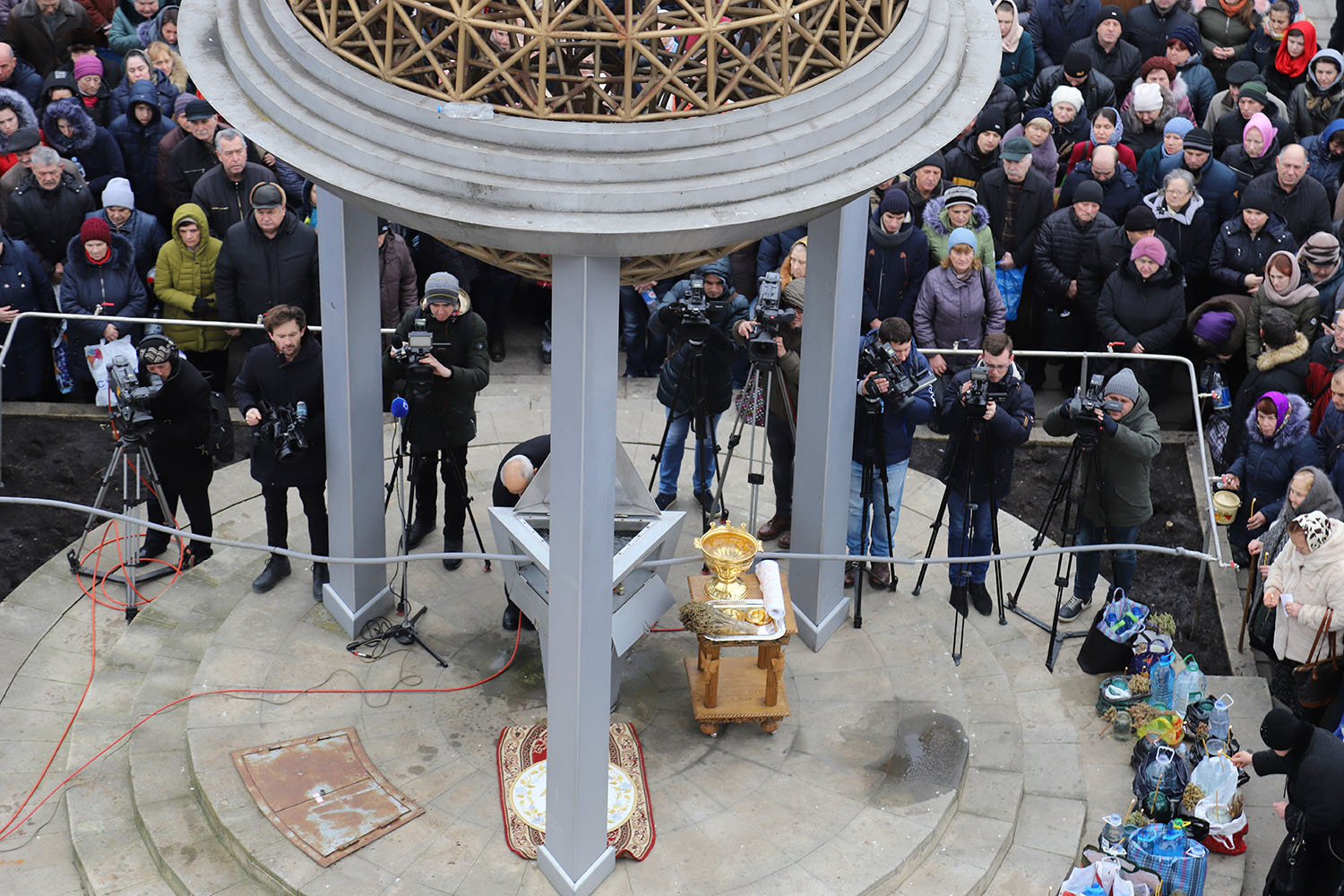 По заамвонной молитве при пении тропарей «Глас Господень на водах» священнослужители вышли на соборную площадь перед специально устроенной «Иорданью», где было совершено великое освящение воды.