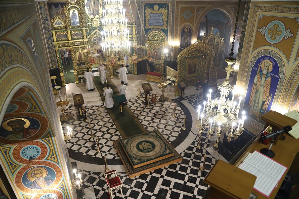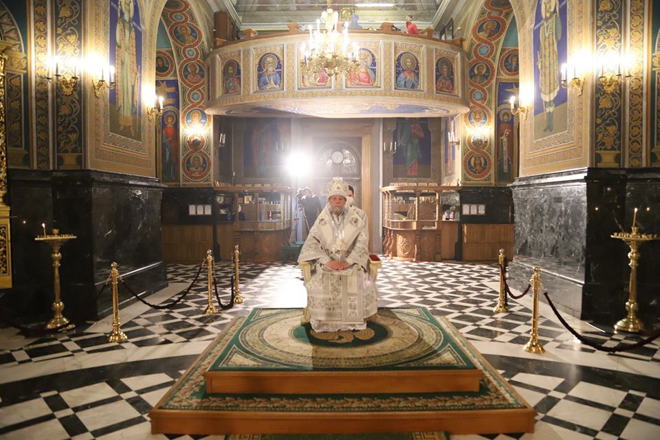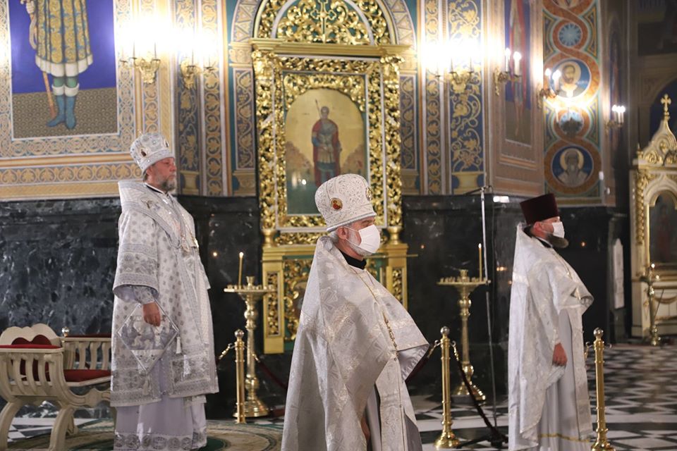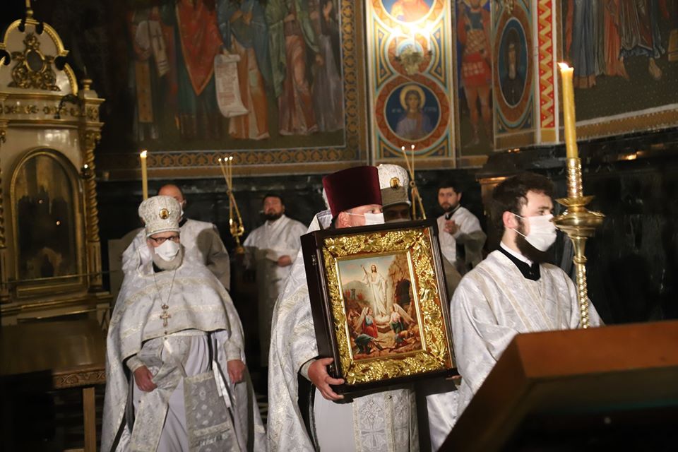После девятой песни Пасхального канона на заутрени, Высокопреосвященный Митрополит Владимир зачитал огласительное слово святителя Иоанна Златоуста. Затем Его Высокопреосвященство обратился к верующим, находящимся в связи с пандемией Covid-19 по своим домам, с архипастырским словом утешения и поздравления по случаю Светлого праздника Воскресения Христова — Пасхи Господней.