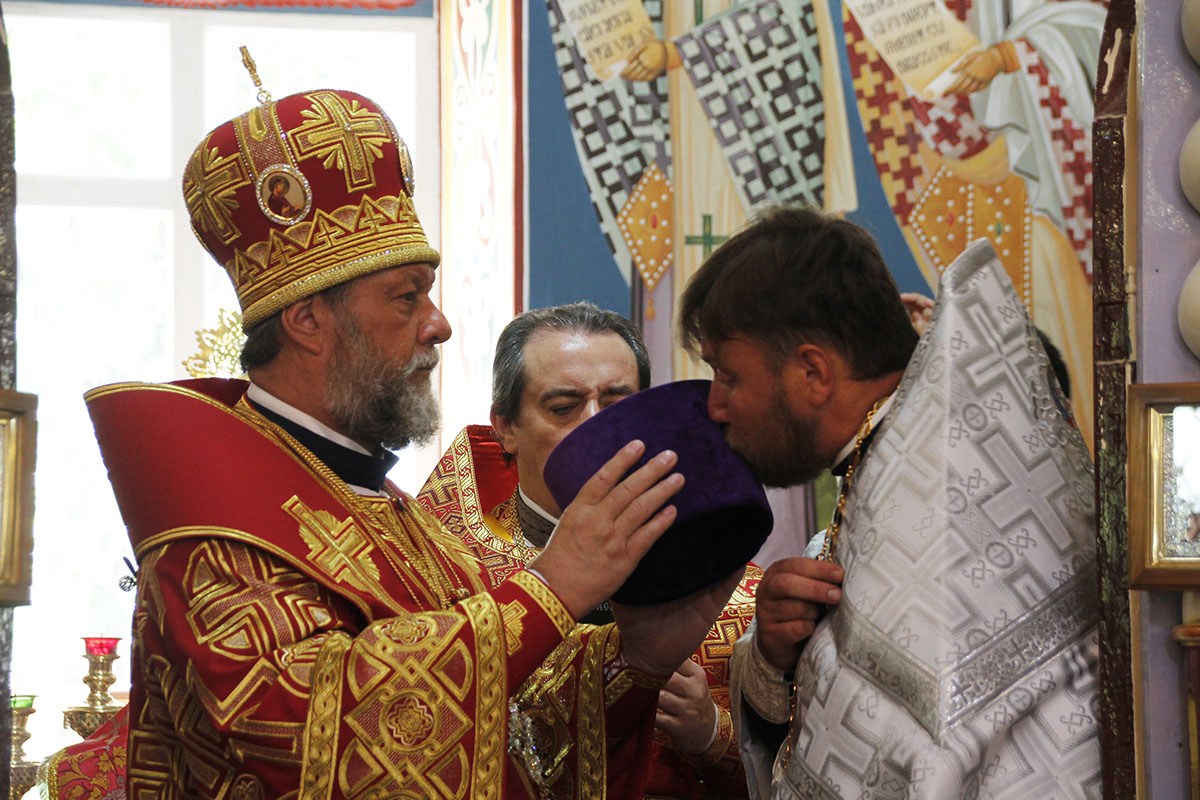 На Малом входе, во внимание к пастырским и церковным трудам по благоустройству Георгиевского прихода с. Кожушна Высокопреосвященный Митрополит Владимир удостоил настоятеля храма прот. Сергея Жмуркова высокой богослужебной награды — митрой.