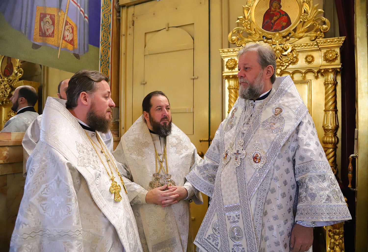 Его Высокопреосвященству сослужили: архиепископ Тираспольский и Дубоссарский Савва, епископ Кагульский и Комратский Анатолий, епископ Унгенский и Ниспоренский Петр, епископ Бельцкий и Фэлештский, епископ Единецкий и Бричанский Никодим, викарные епископы Сорокский Иоанн и Орхейский Силуан, секретарь Молдавской митрополии митр. прот. Вадим Кейбаш,  благочинный церквей Сорокского района митр. прот. Николай Кравец, архимандрит Иоанн (Данилеску), секретарь Кагульско-Комратской епархии митр. прот. Михаил Мунжиу, соборное духовенство.