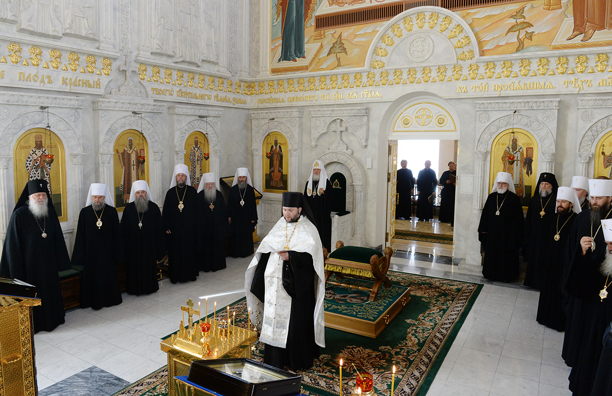 Перед началом заседания Святейший Патриарх Кирилл и члены Священного Синода прошли в крестовый храм Патриаршей резиденции, освященный в честь Всех святых, в земле Русской просиявших, и помолились за литией по новопреставленнному митрополиту Киевскому и всея Украины Владимиру.