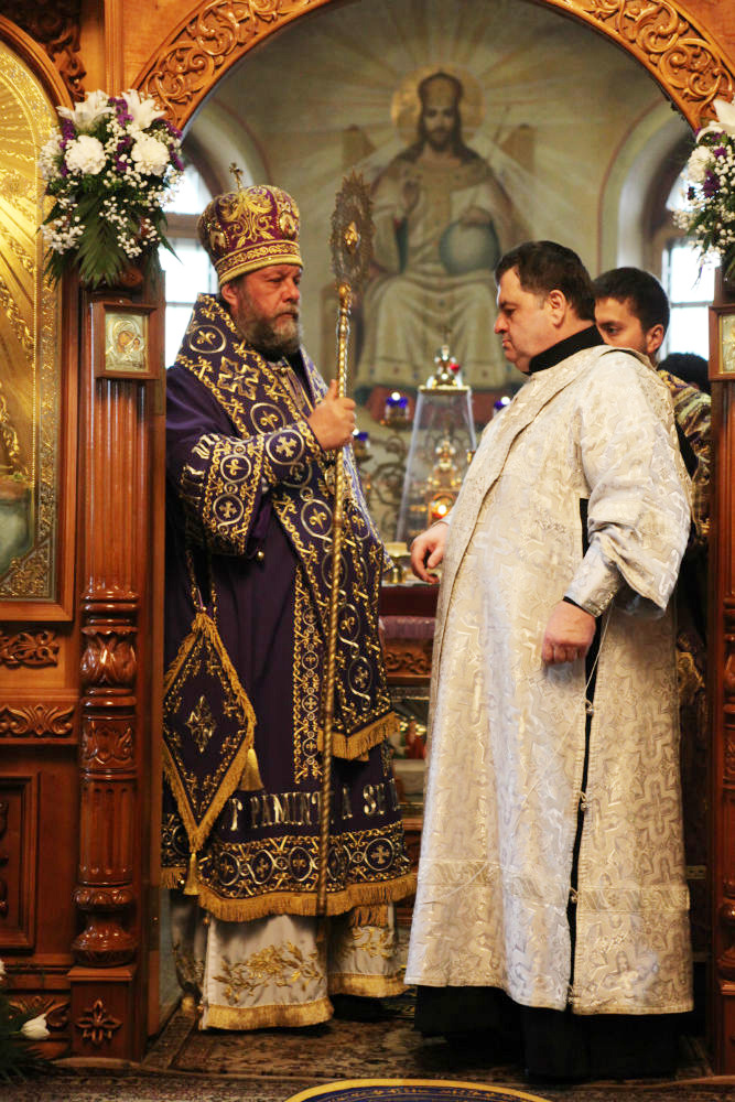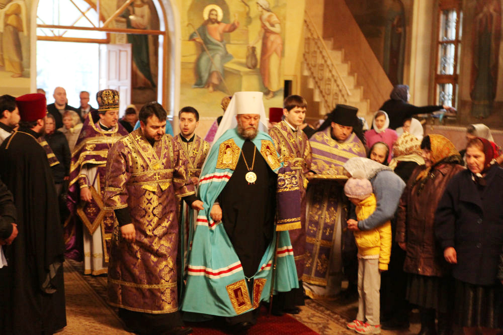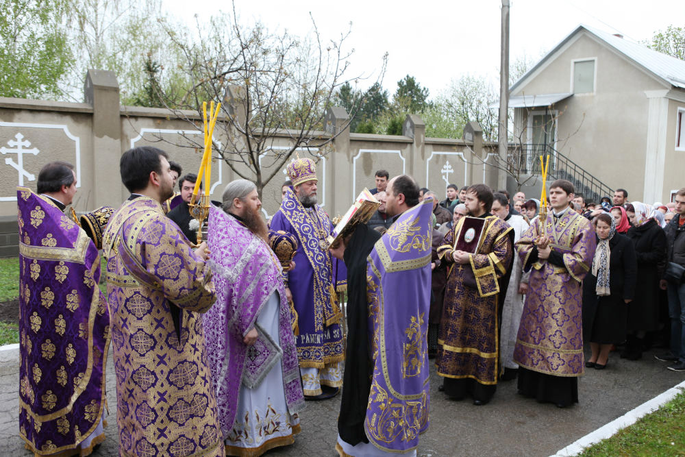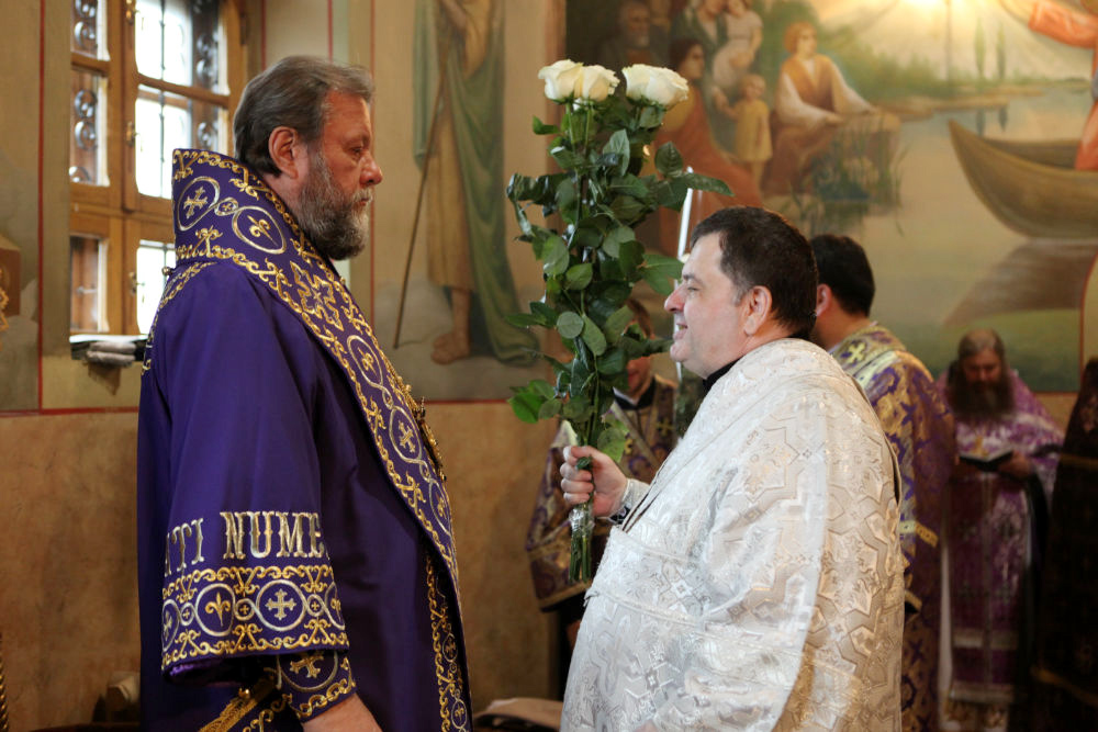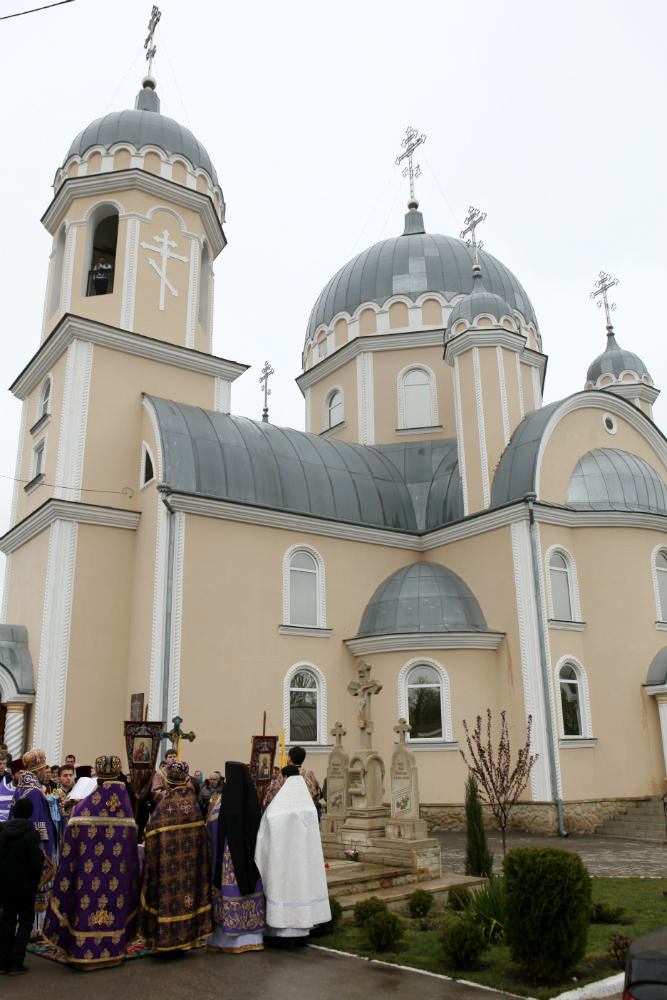 Его Высокопреосвященству сослужили: секретарь Митрополии митр. прот. Вадим Кейбаш, игумен Успенского Цыганештского мужского монастыря архим. Иринарх (Костру), благочинный церквей Дрокиевского района митр. прот. Павел Вулуцэ и духовенство храма.