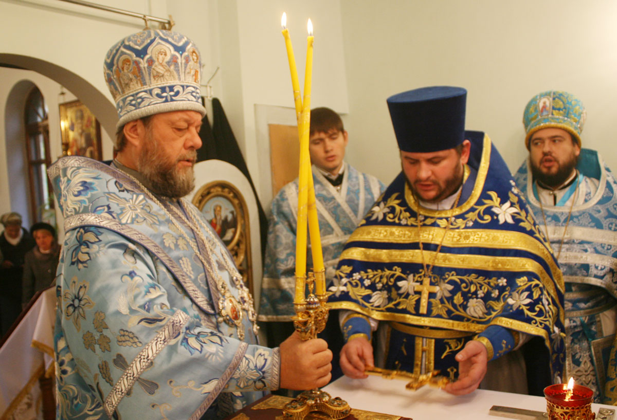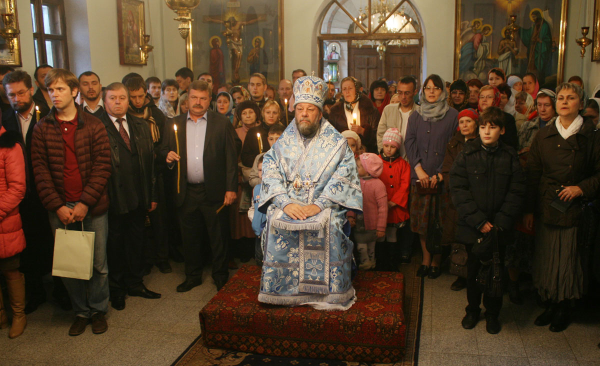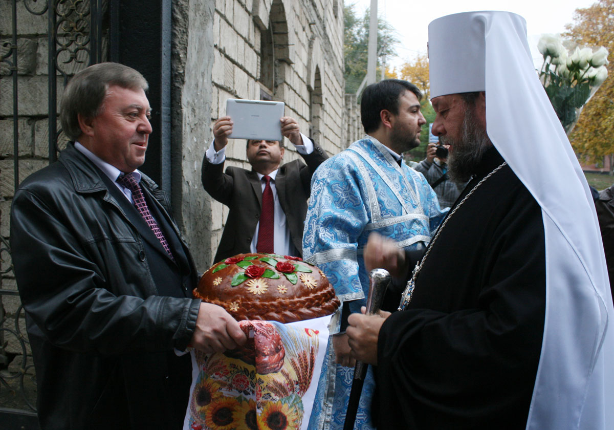Прот. Виктор Лукин, настоятель Покровского храма, выразил от лица всей приходской общины сердечные слова благодарности архипастырю за непрестанную поддержку и отеческие советы по восстановлению разрушенного храма. Священник выразил надежду, что Высокопреосвященный владыка Владимир и далее будет поддерживать приходскую общину в этом богоугодном деле. В знак признательности и сыновнего почтения, отец Виктор Лукин передал в дар Предстоятелю образ Божией Матери «Покрова», искусно выполненный столичным умельцем.