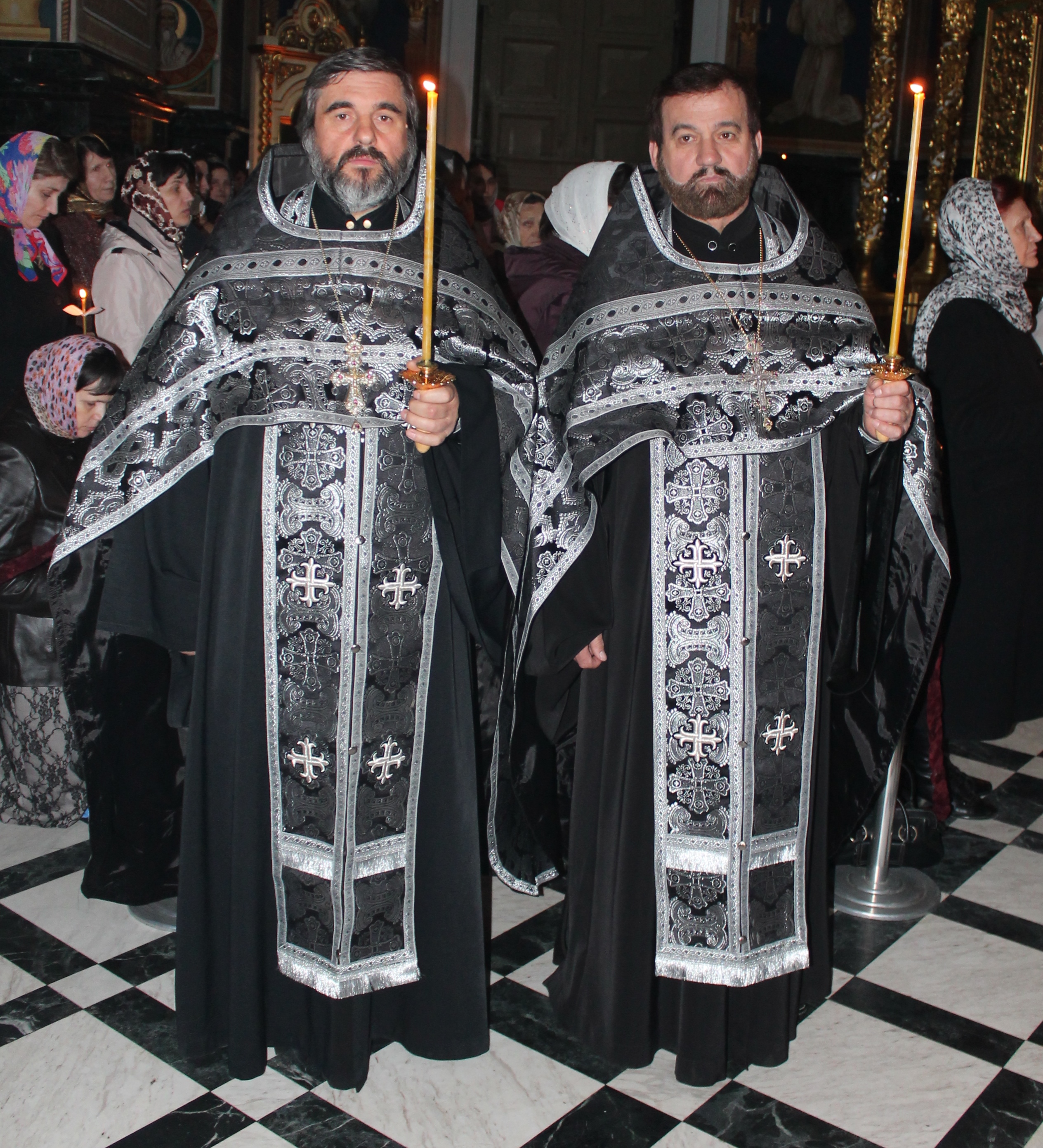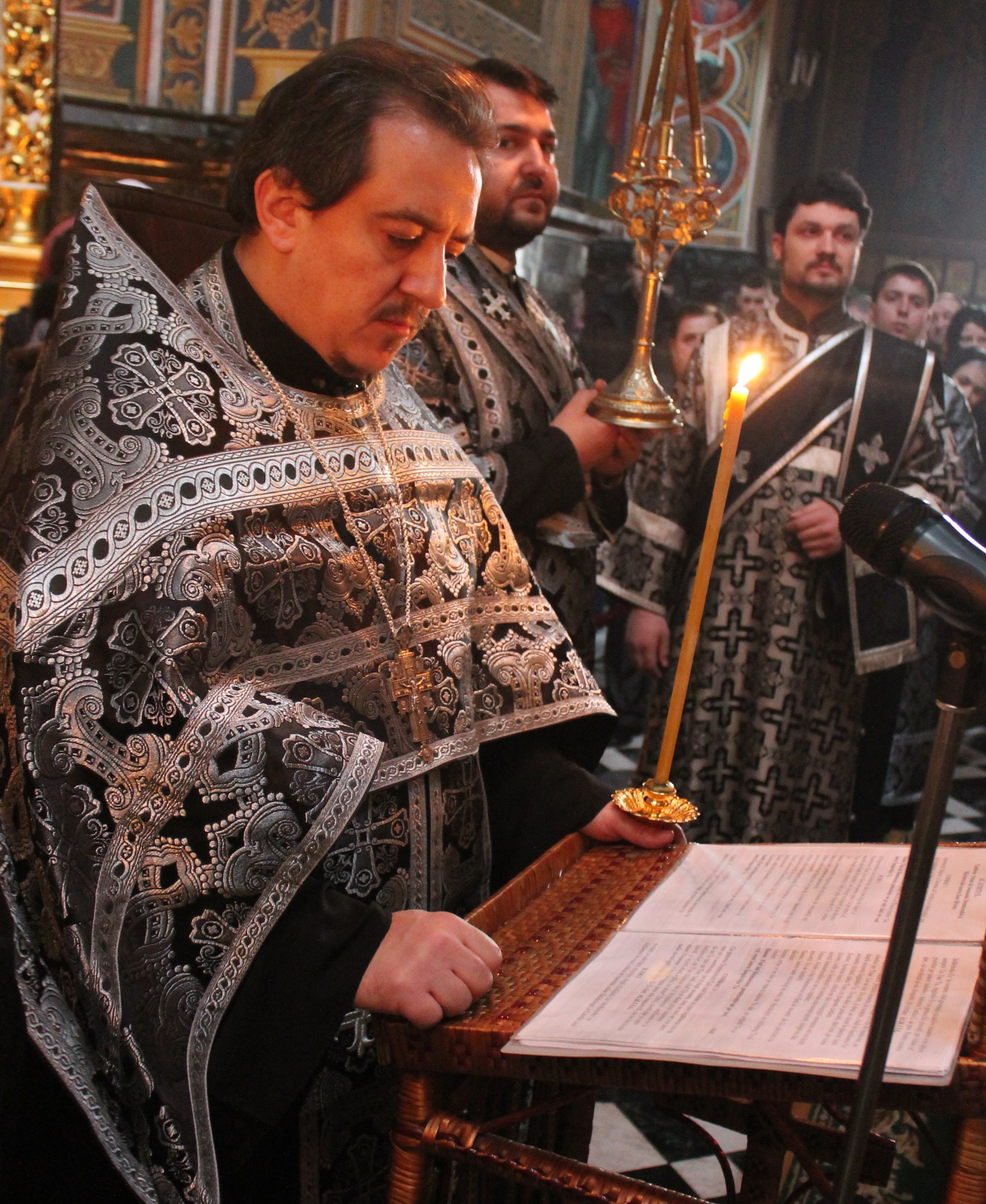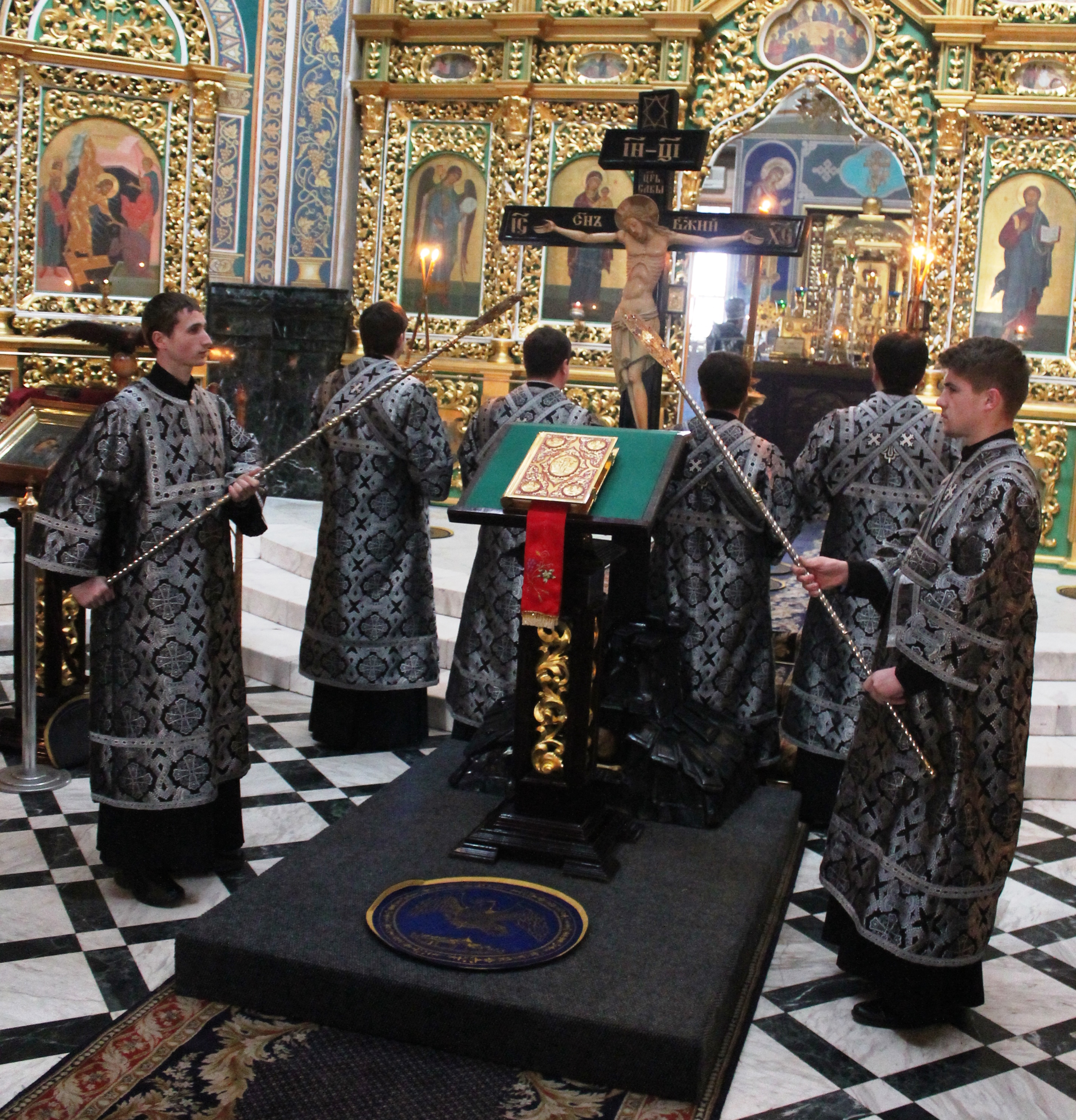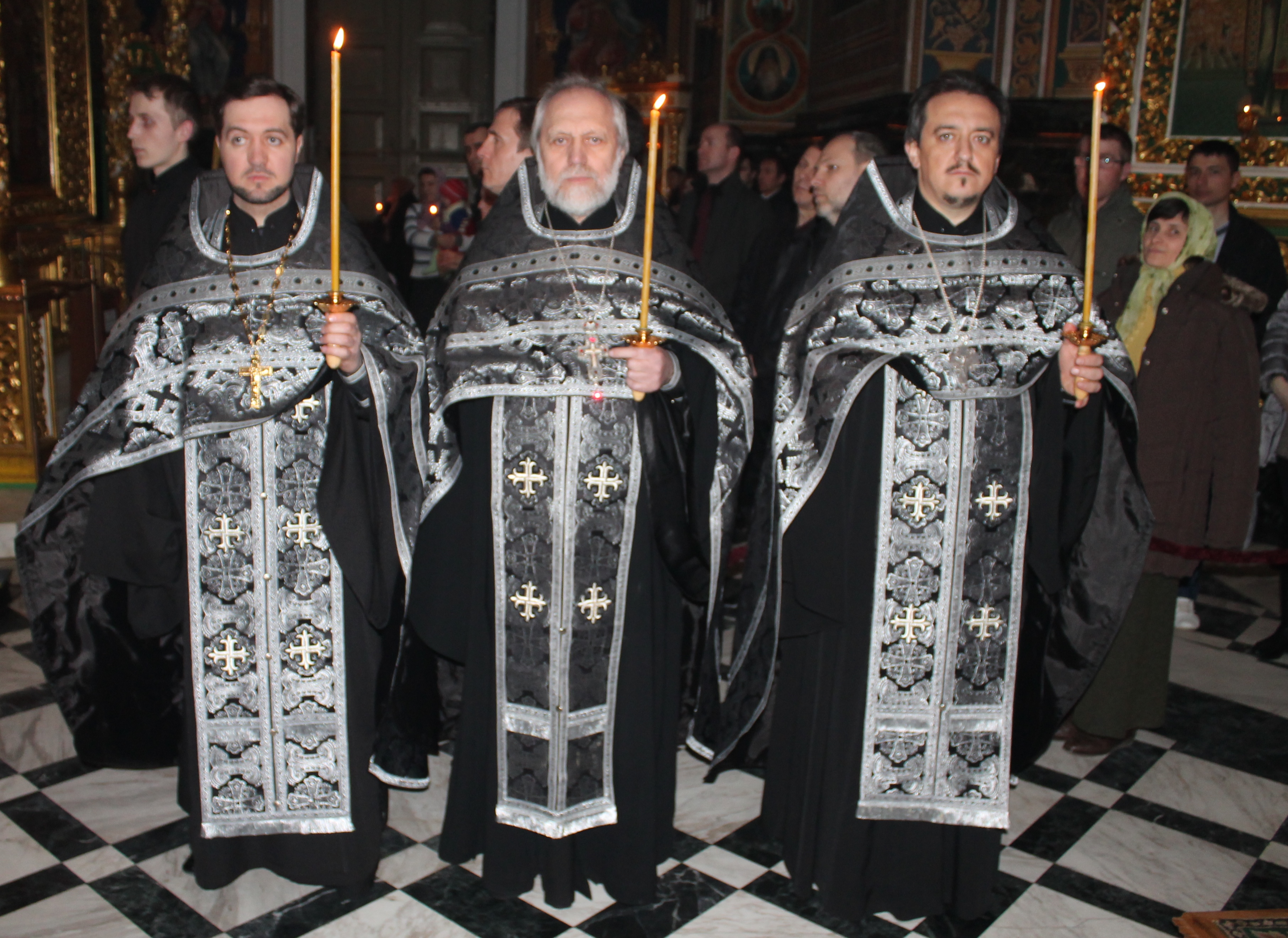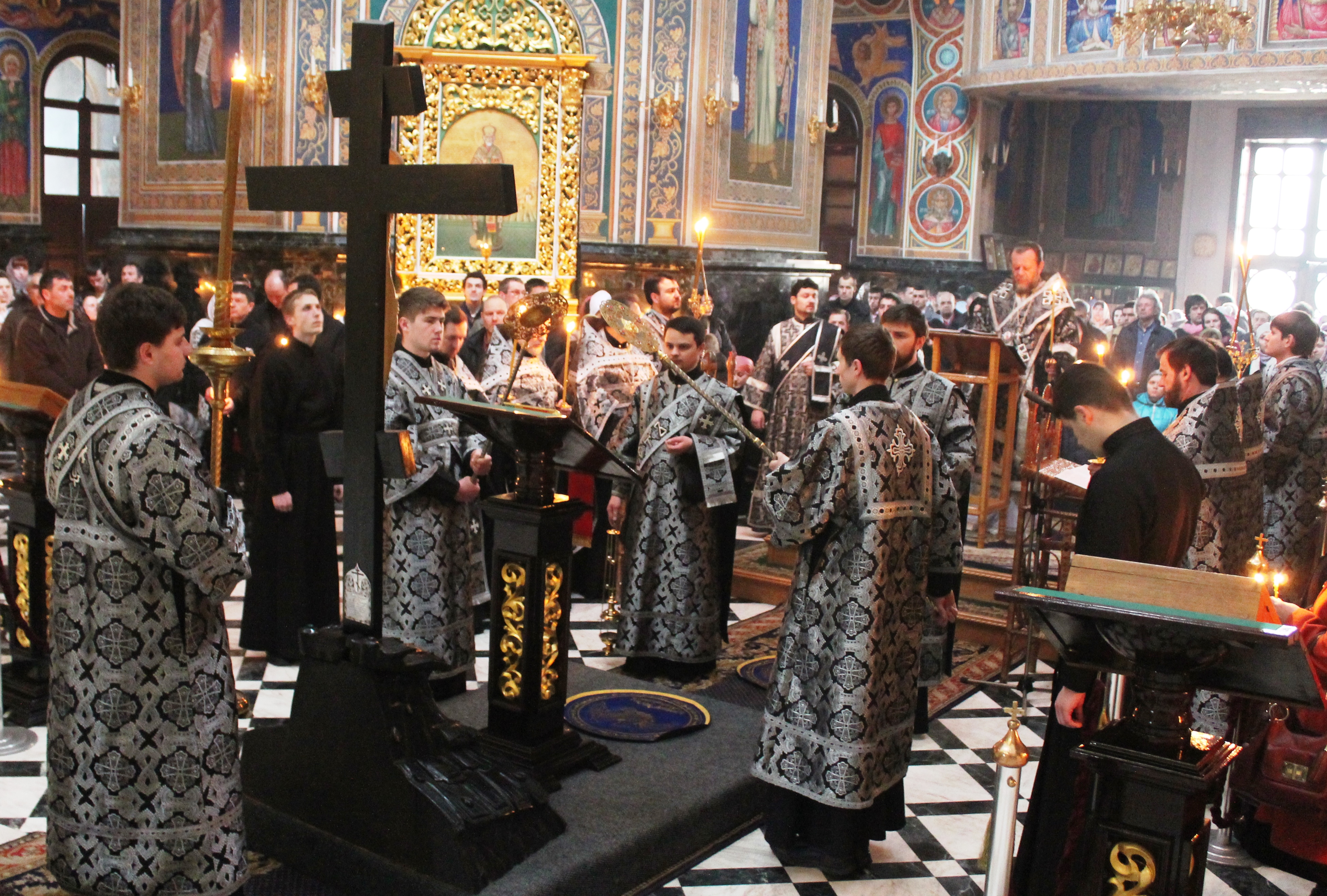 Этим вечером Высокопреосвященный митрополит Владимир вместе с духовенством кафедрального собора совершил богослужение пассии с чтением акафиста Страстям Христовым.