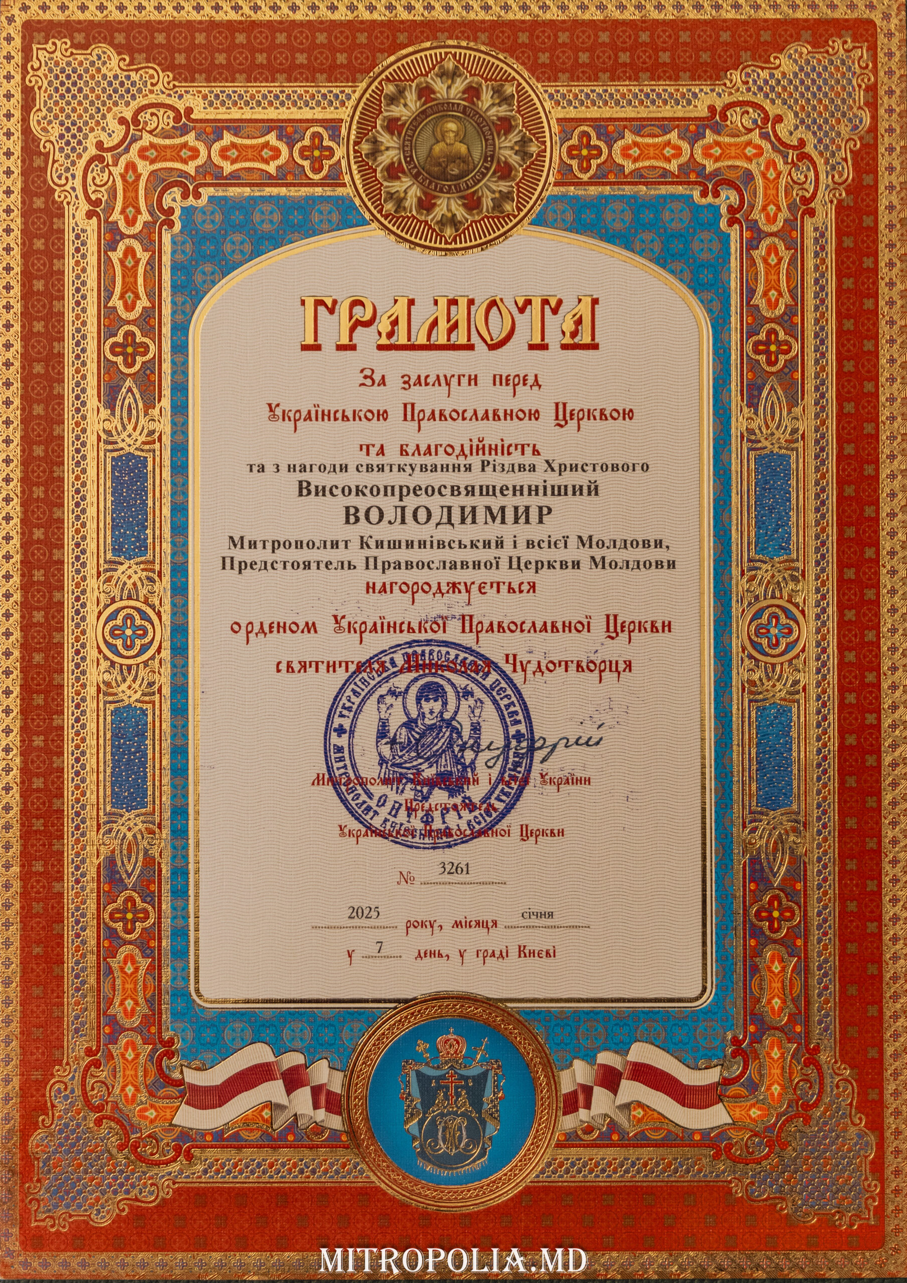 Также, в связи с 35-летием архиерейской хиротонии отдельной высокой церковной награды был удостоен Высокопреосвященный Митрополит Кишиневский и всея Молдовы Владимир. Блаженнейший Митрополит Киевский и всея Украины Онуфрий наградил Митрополита Владимира орденом Украинской Православной Церкви — святителя Николая Чудотворца, который был вручен Предстоятелю Православной Церкви Молдовы архиепископом Унгенским и Ниспоренским Петром.